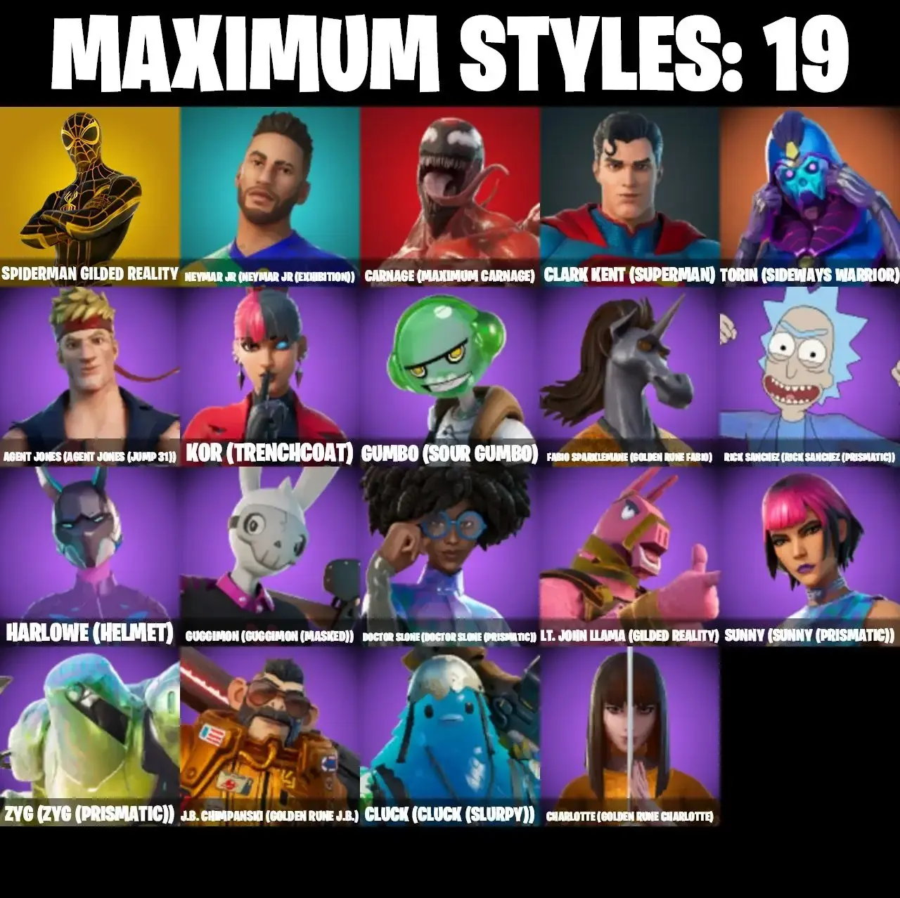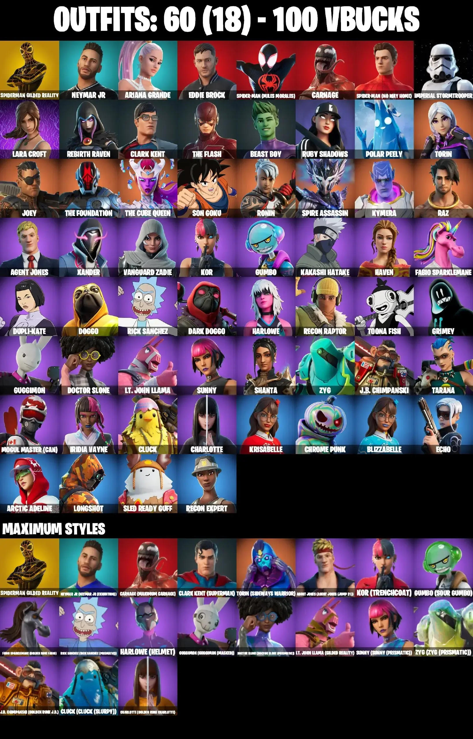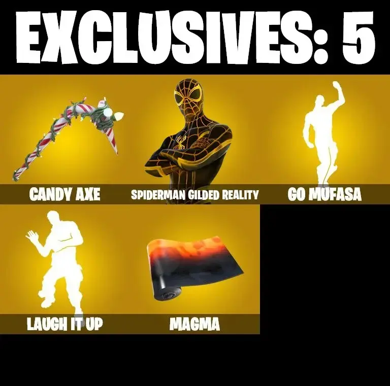 60 SKINS | GILDED SPIDER-MAN | LARA CROFT | SPIDER-MAN MILES MORALES | SPIDER-MAN NO WAY HOME | IMPERIAL STORMTROOPER | THE FLASH | GO MUFASA | GET GRIDDY | MOGUL MASTER CAN | LAUGH IT UP | BTS EMOTE | CANDY AXE | KAKASHI | CHARLO
