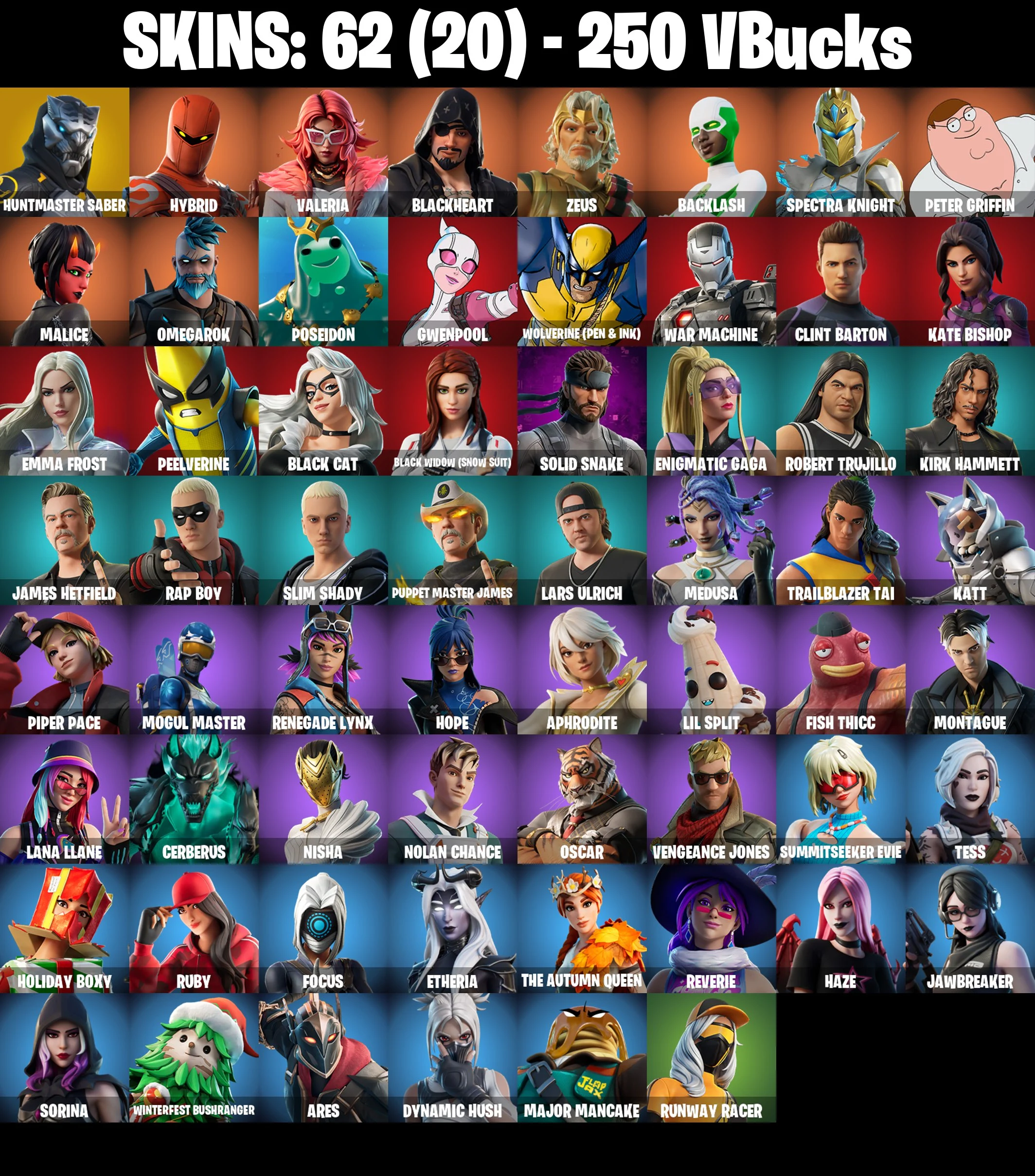 🎆62 SKINS ⚡️PC⚡️ HUNTMASTER SABER 👑 HYBRID 👑 VALERIA 👑 BLACKHEART 👑 ZEUS 👑 BACKLASH 👑 SPECTRA KNIGHT 👑 PETER GRIFFIN 👑 MALICE 👑 OMEGAROK ⚡️ 250 VB #M469