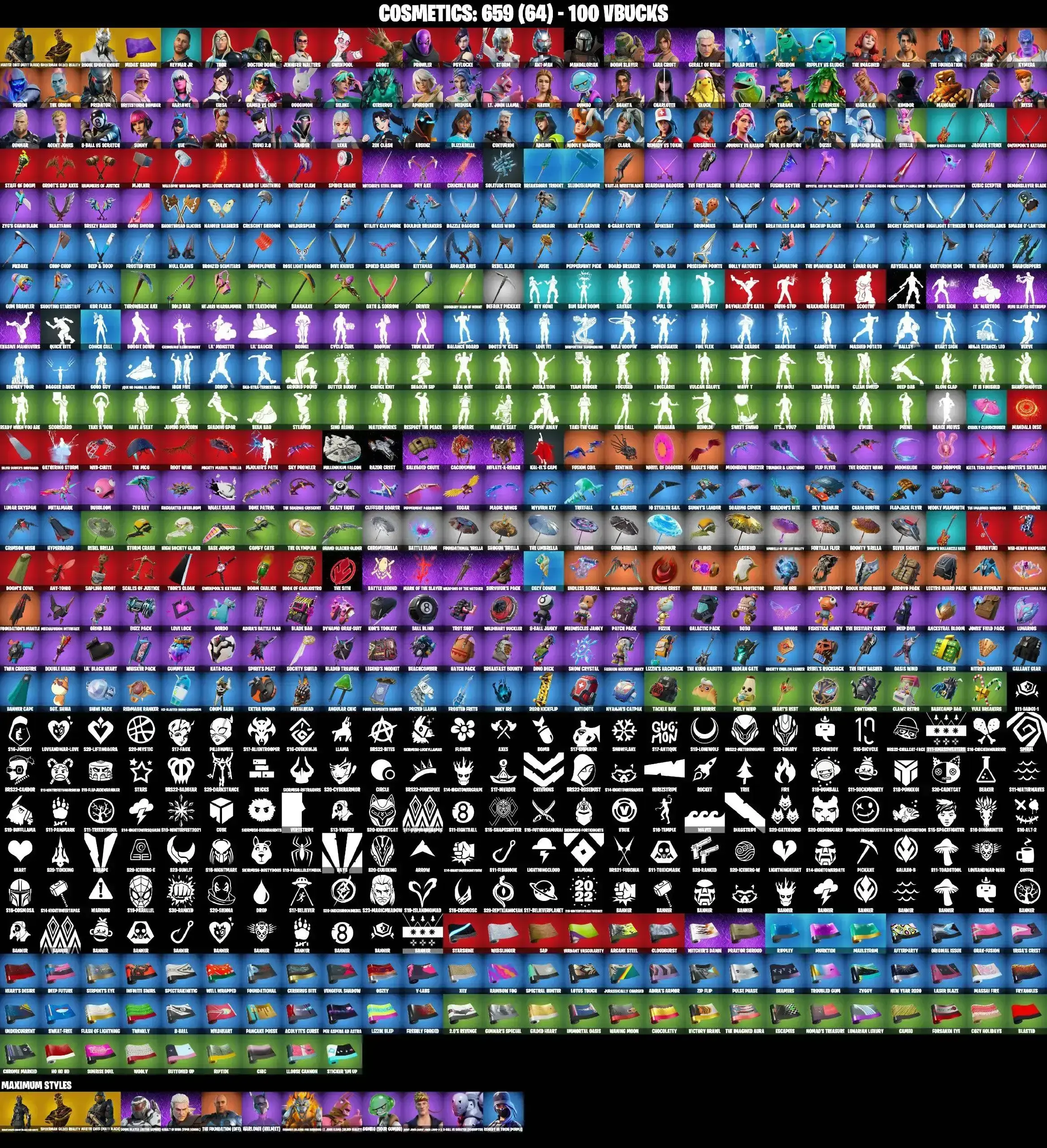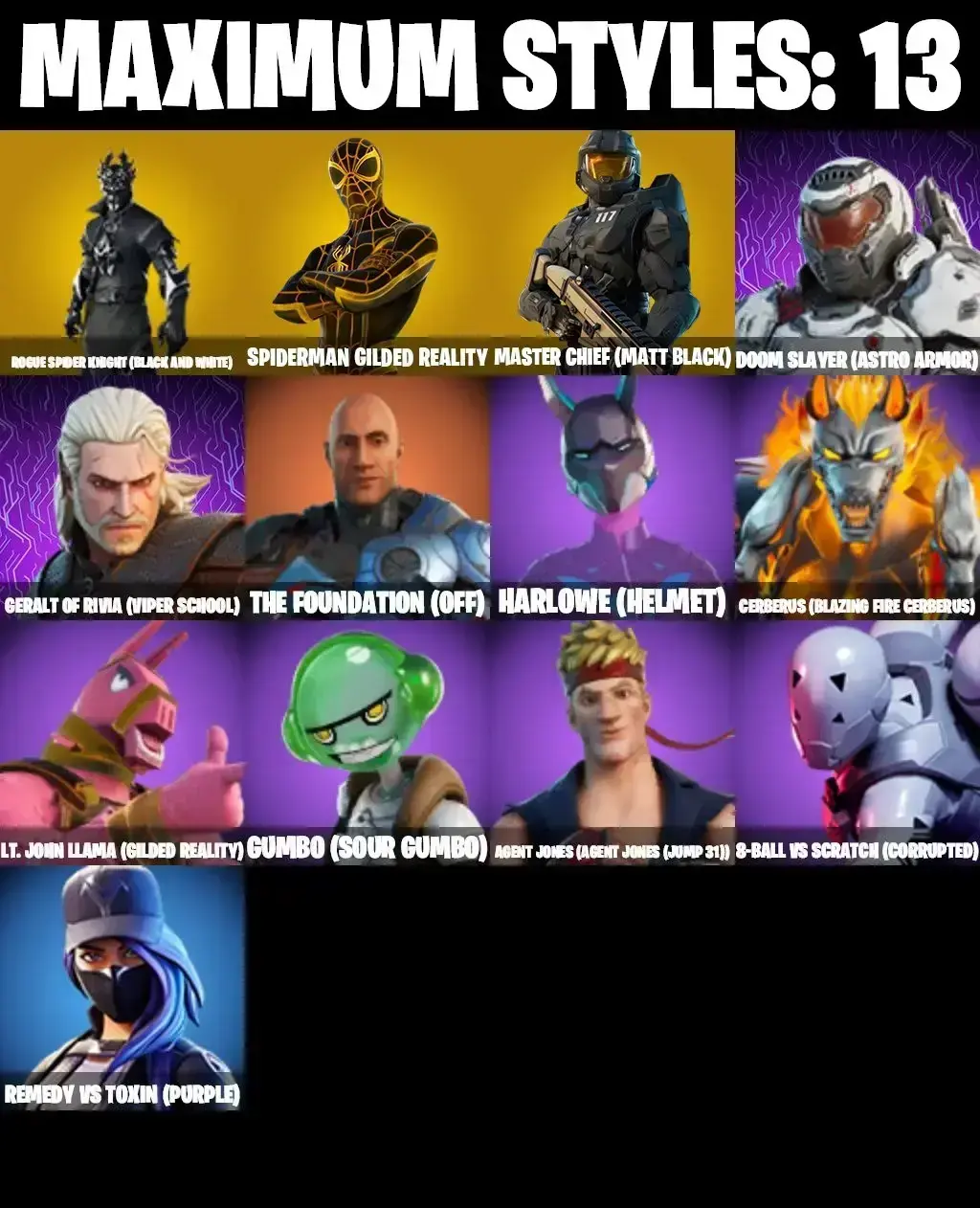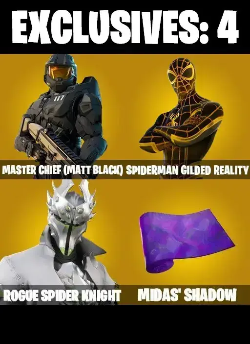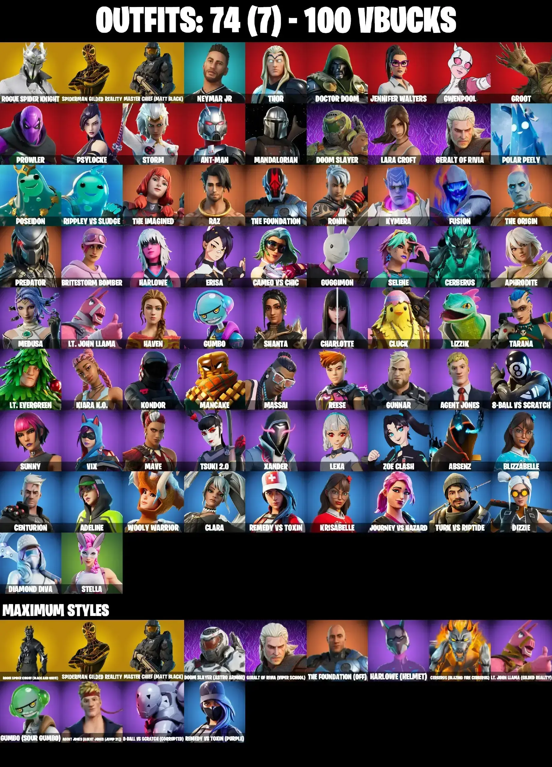 74 SKINS | MASTER CHIEF MAX | ROGUE SPIDER KNIGHT MAX | GILDED SPIDER-MAN | MANDALORAIN | LARA CROFT | PREDATOR | CHARLOTTE | TSUKI 2.0 | 8-BALL MAX | STELLA | PEPPERMINT PICK | CAN PLAY ON PSN,XBOX,PC,NINTENDO,MOBILE | 100 VBUC