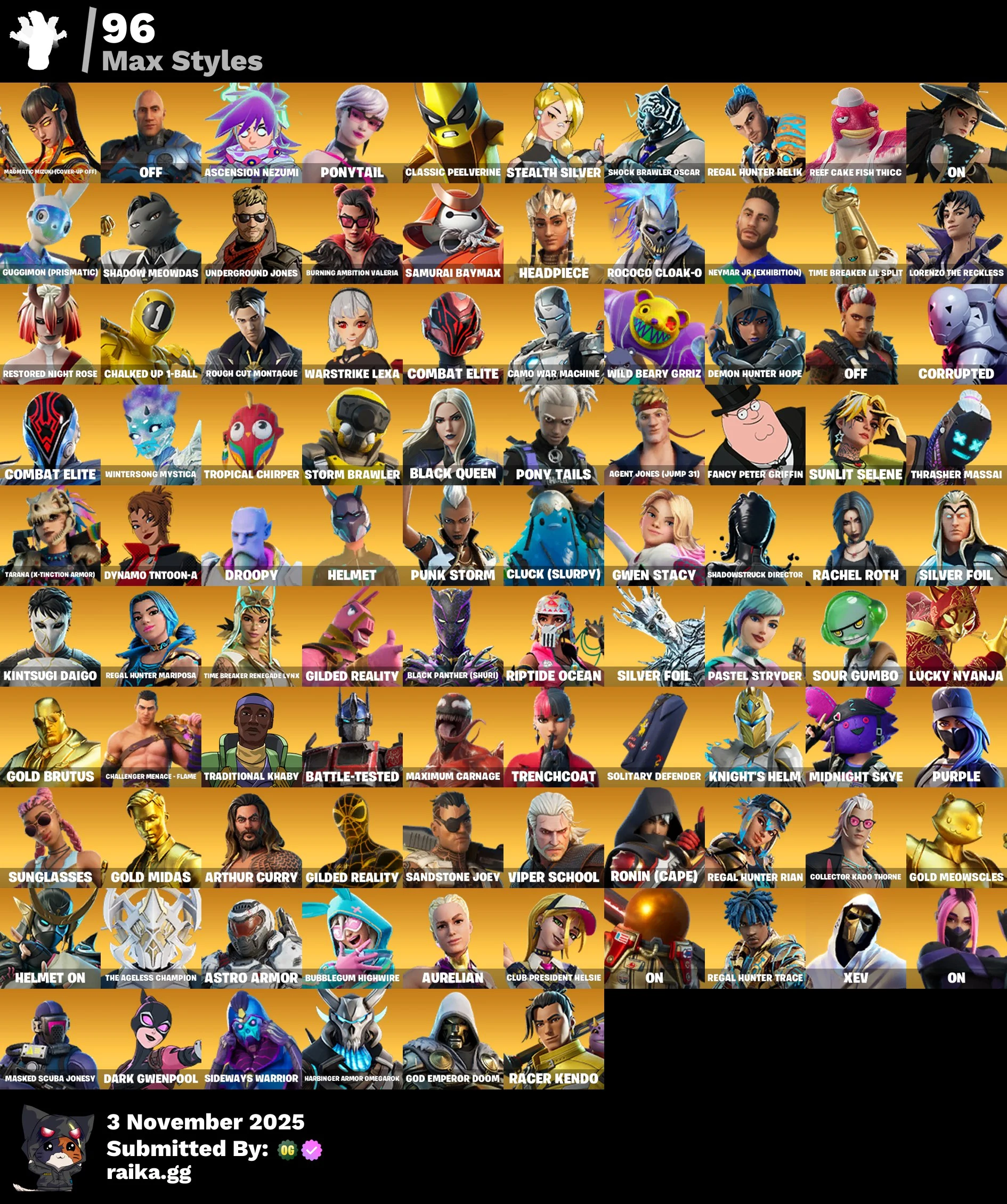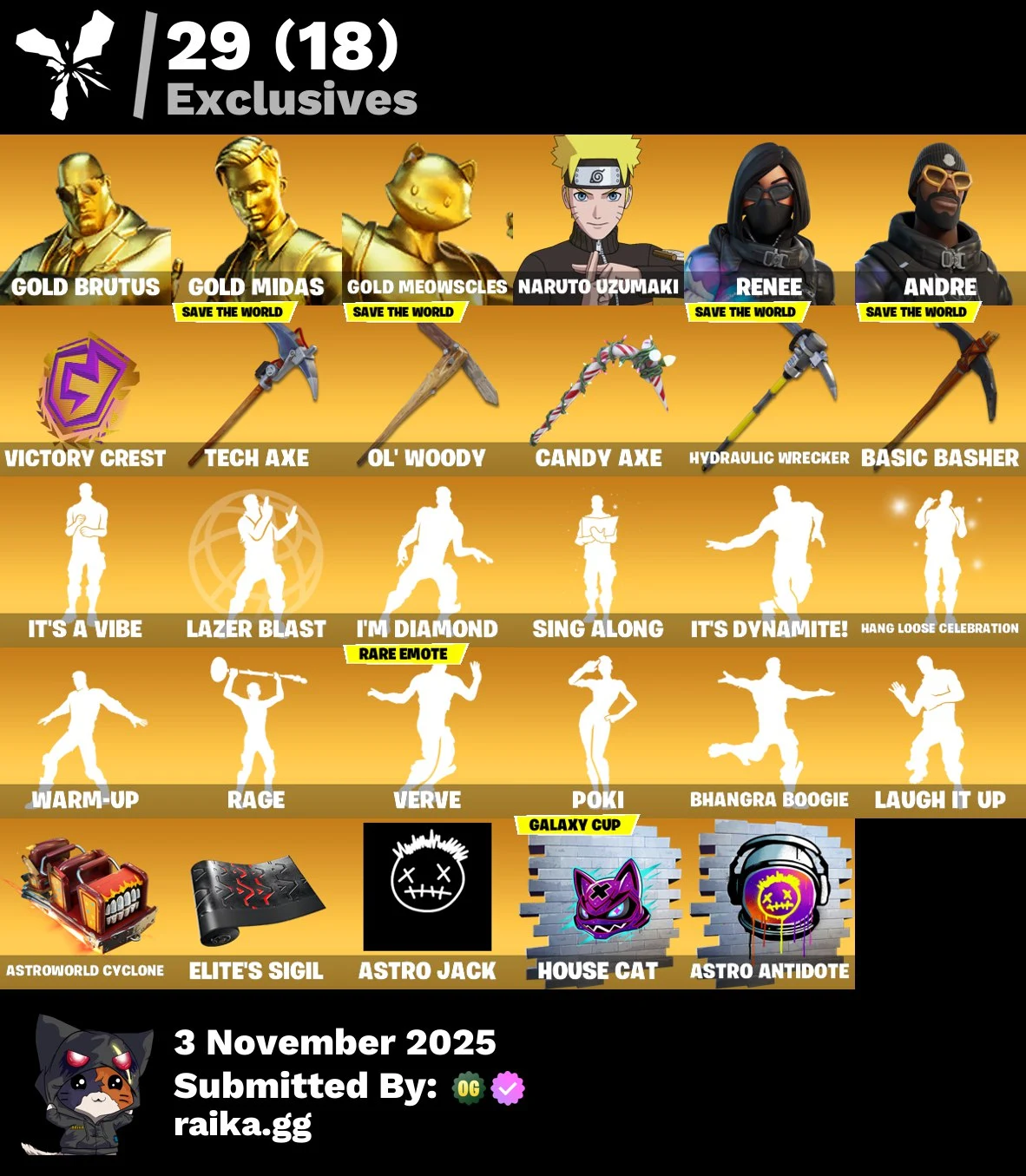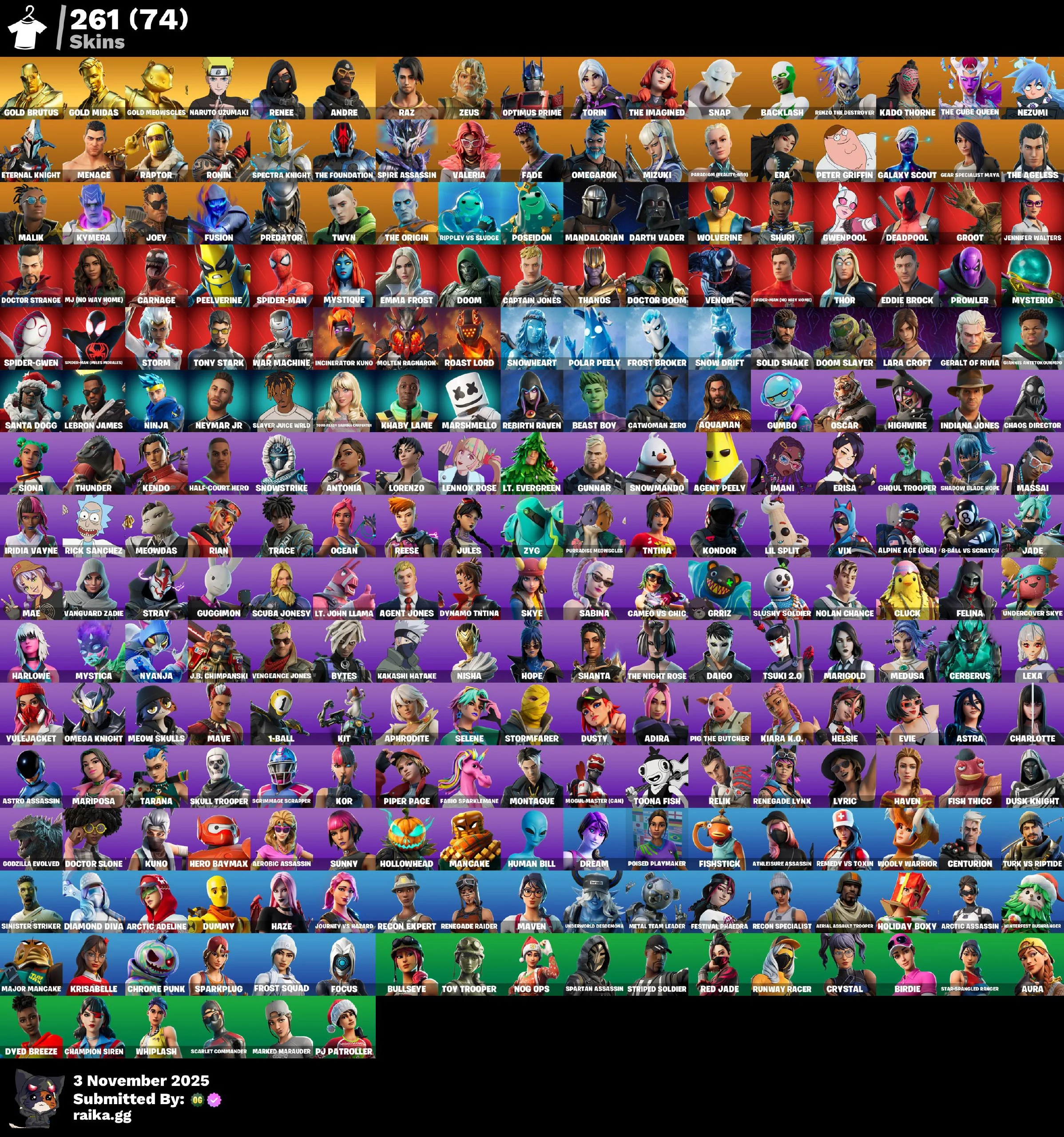 [PC] 261 skins | Renegade Raider | Aerial Assault Trooper | Gold Brutus | Gold Midas | Gold Meowscles | Naruto Uzumaki | Renee | Andre | Raz | Zeus | 250 VB