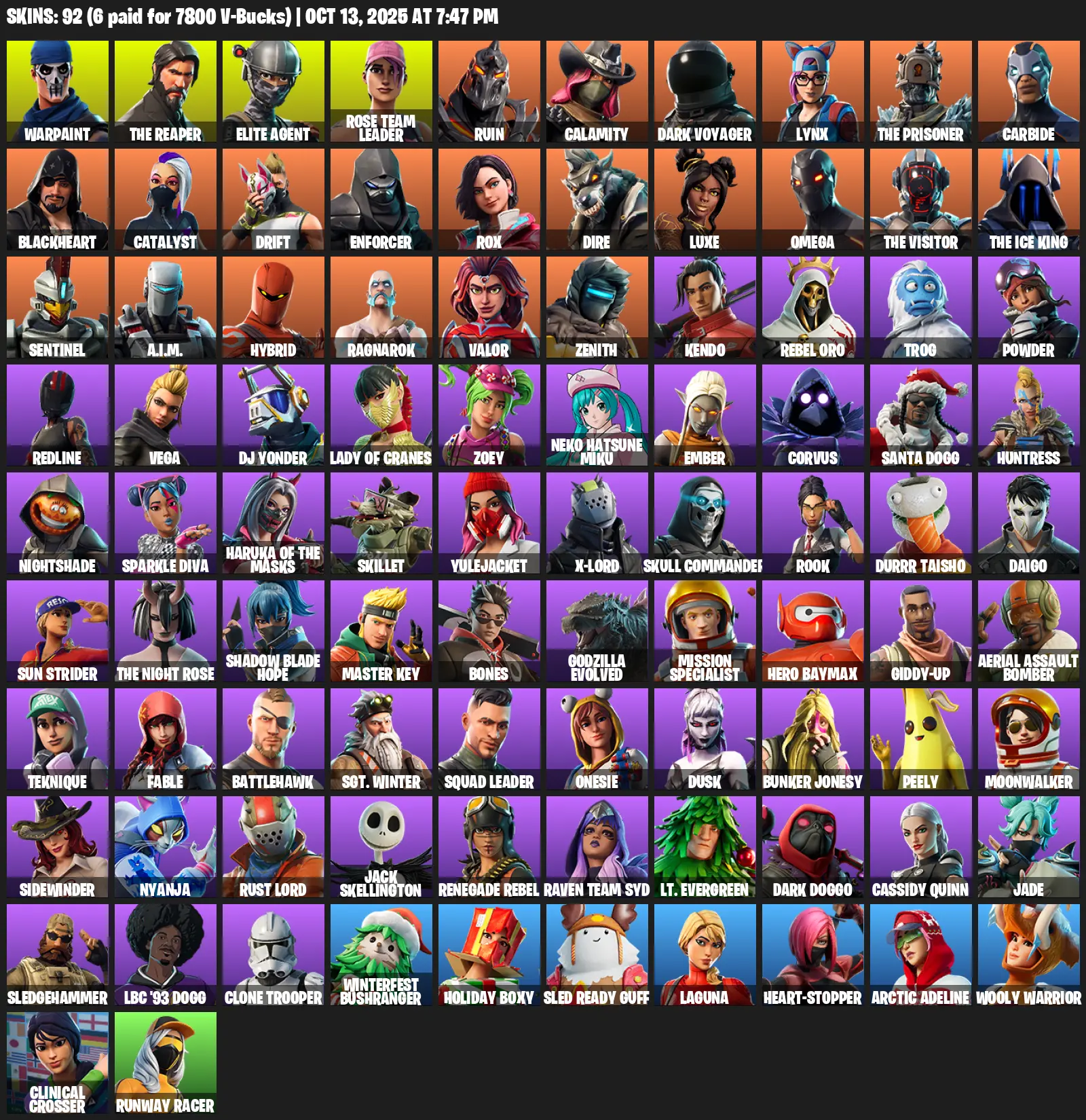 [PC] | 92 skins | Take The L | OG STW | The Reaper | Elite Agent | Omega | Warpaint | Rose Team Leader | Ruin | Calamity | #RGV2302 | #MBFN