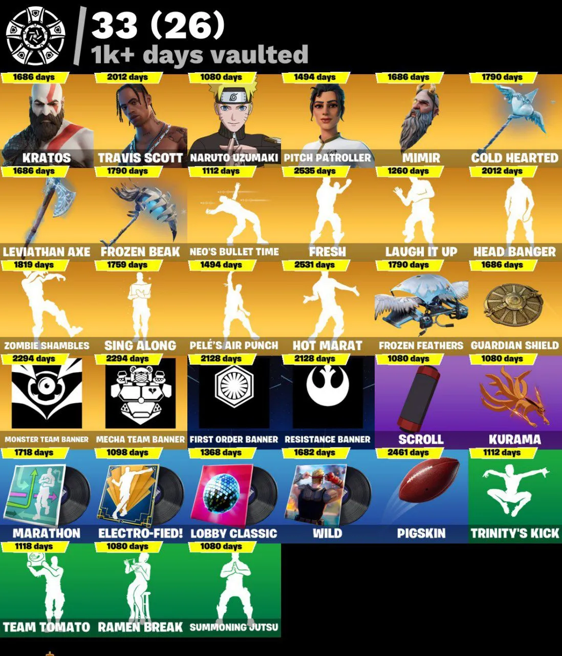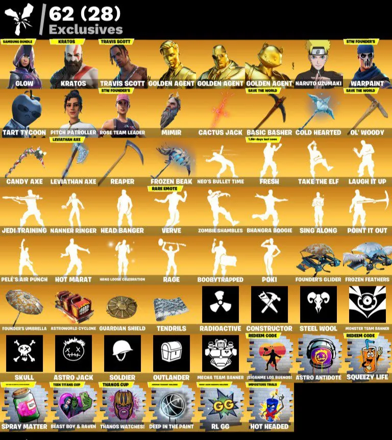 [PC | PSN | XBOX] 332 skins 🔆 Glow 🔆 Kratos | Travis Scott 🔆 Super Deluxe Edition : ✅ 🔆 Gold Midas 🔆 Gold Brutus 🔆 Gold Meowscles 🔆Leviathan Axe 🔆Naruto Uzumaki 🔆 Tart Tycoon 🔆Pitch Patroller 🔆 2900 VB