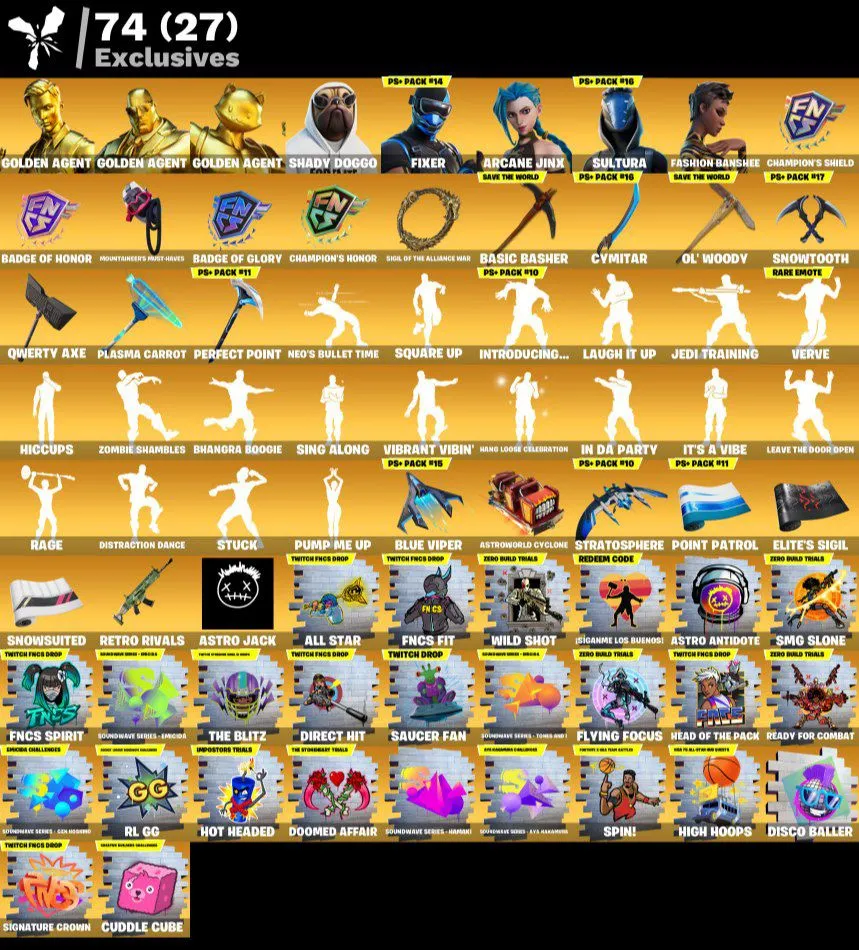 [PC | PSN | XBOX] 356 skins | Arcane Jinx | Gold Midas | Gold Brutus | Gold Meowscles | Shady Doggo | Fixer | Tryhard | Sultura | Fashion Banshee | Galaxy Scout | Zombie Shameless | 750 VB