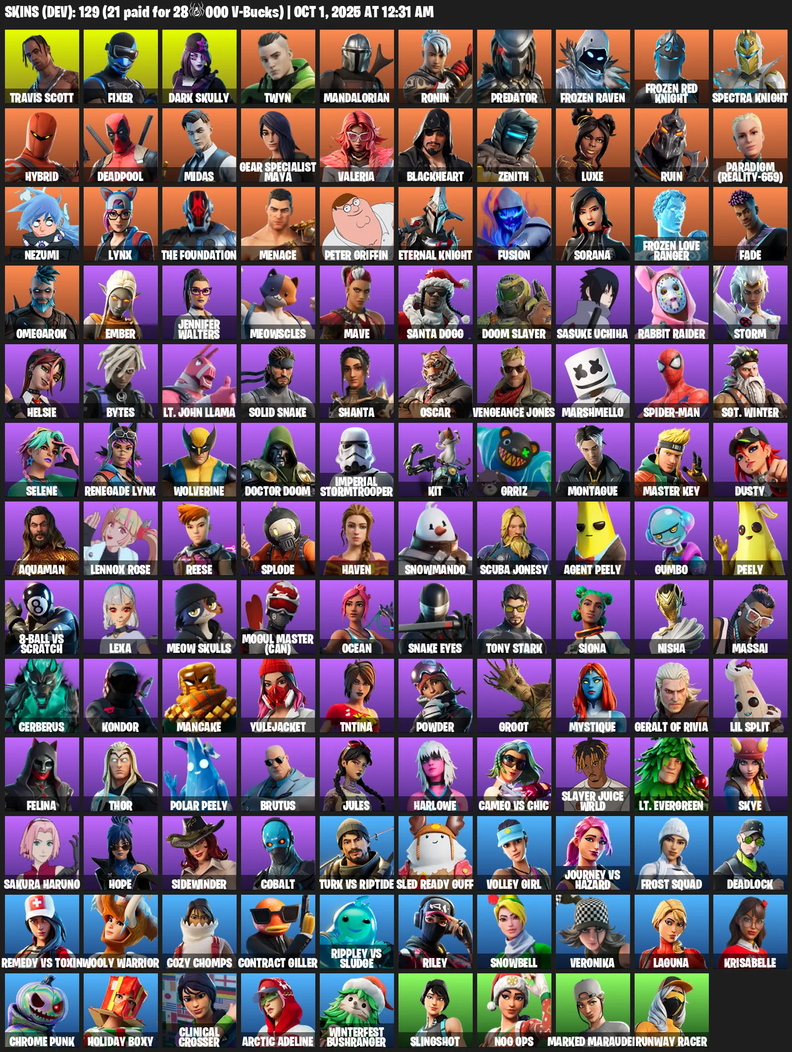 [PC/PSN] 129 Skins | Travis Scott | Fixer | Dark Skully | Twyn | Mandalorian | Ronin | Predator | Frozen Raven | Frozen Red Knight | Spectra Knight | Hybrid | Deadpool | Midas | Gear Specialist Maya | Valeria | Blackheart | Zenith | Luxe | Ruin