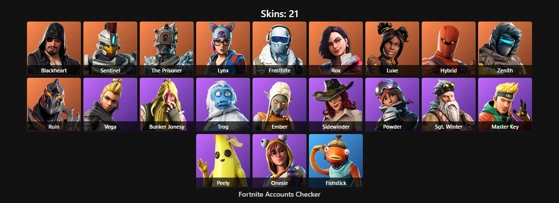 PC/PSN 21 Skins⚡ | Peely | Blackheart | Sentinel | The Prisoner | Lynx | Frostbite | Rox | Luxe | Hybrid | Zenith | Ruin | Vega | Bunker Jonesy | Trog
