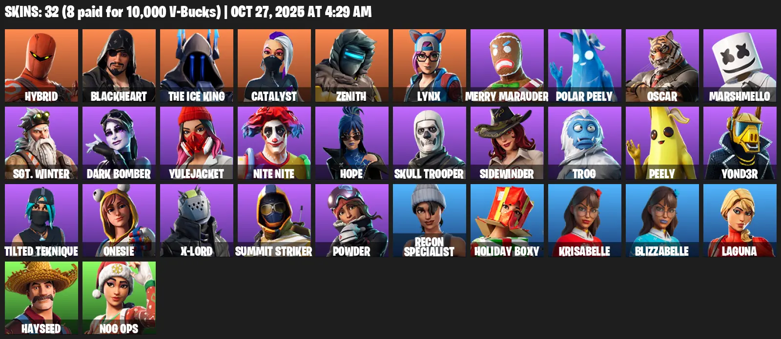 [PC/PSN] | 32 skins | Reaper Axe | Hybrid | Blackheart | The Ice King | Catalyst | Zenith | Lynx | Merry Marauder | Polar Peely | Oscar | S4G