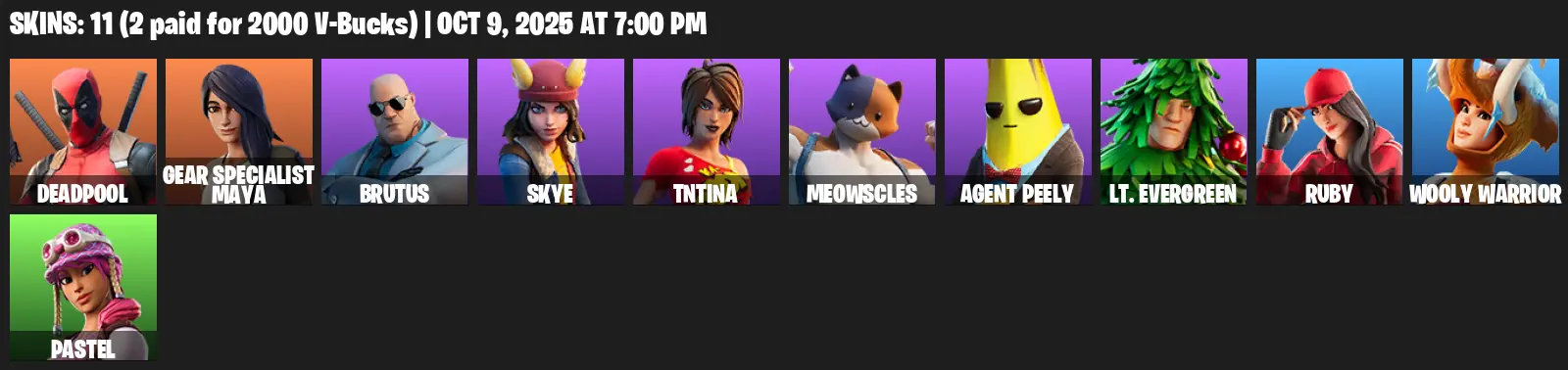 [PC/PSN/XBOX] | 11 skins | Deadpool | Gear Specialist Maya | Brutus | Skye | TNTina | Meowscles | Agent Peely | Lt. Evergreen | Ruby | S4G