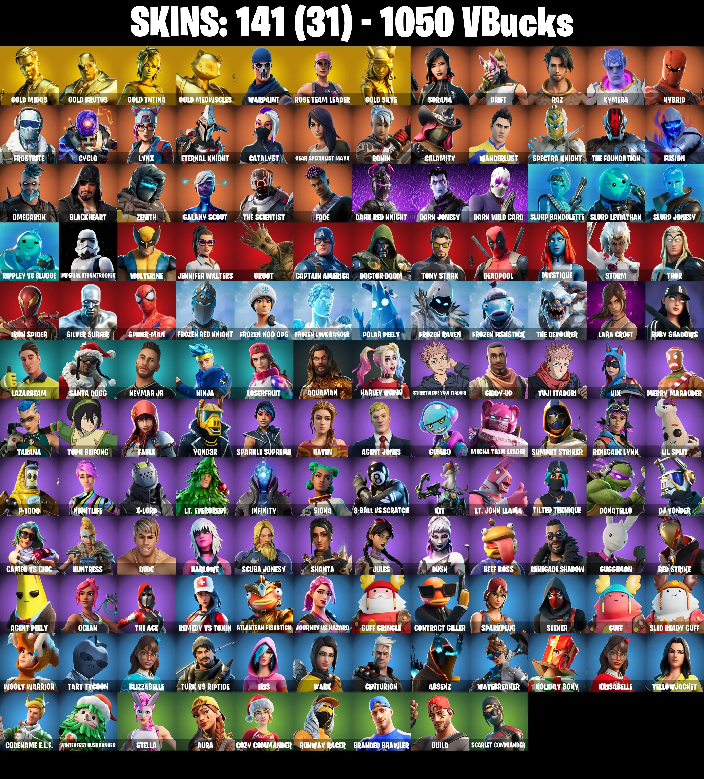 PC/PSN/XBOX ♨️141 skins ✨ OG STW ✨ Yuji Itadori ✨ Lara Croft ✨ Deadpool ✨ Gold Midas ✨ Gold Brutus ✨ Gold TNTina ✨ Gold Meowscles ✨ Drift ✨ Rage ✨ #B876