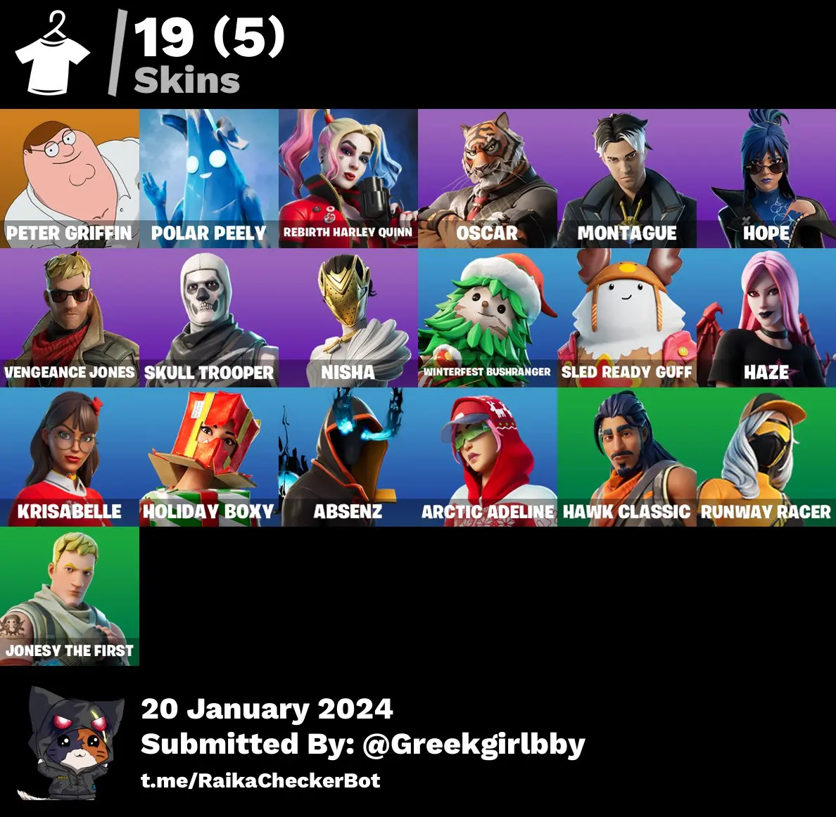 [PC/PSN/XBOX] 19 skins | Peter Griffin | Polar Peely | Rebirth Harley Quinn | Oscar | Vengeance Jones | Skull Trooper |
