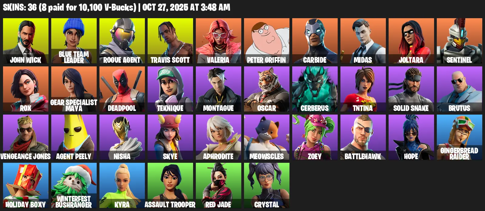 [PC/PSN/XBOX] | 36 skins | Travis Scott | John Wick | Blue Team Leader | Rogue Agent | Valeria | Peter Griffin | Carbide | Midas | Joltara | S4G