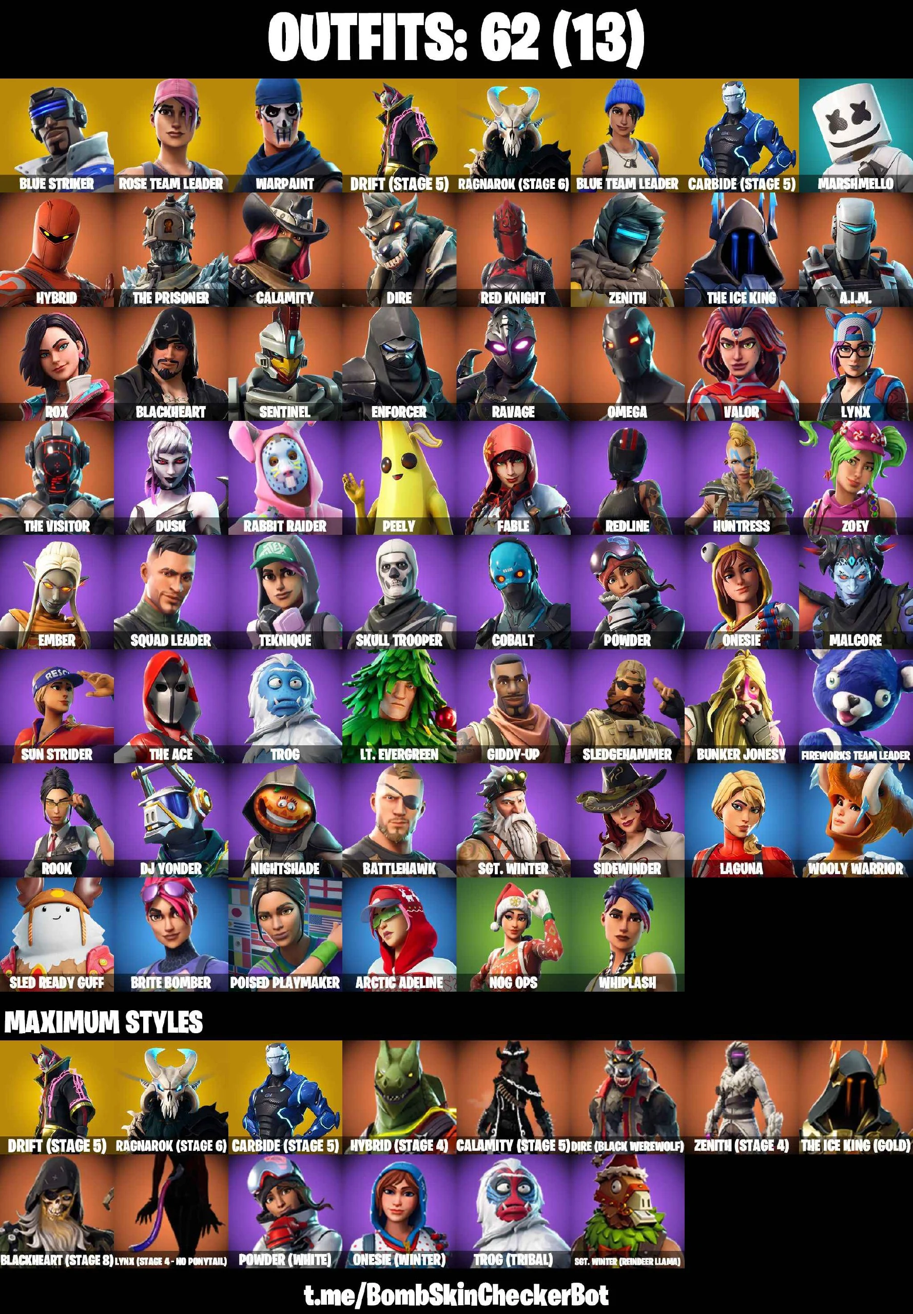 ✅PC/PSN/XBOX✅ 62 Skins✅ OG STW, Ragnarok (Stage 6), Carbide (Stage 5), Skull Trooper, Crowbar, Orange Justice, Peely, Red Knigh✅ Full Access