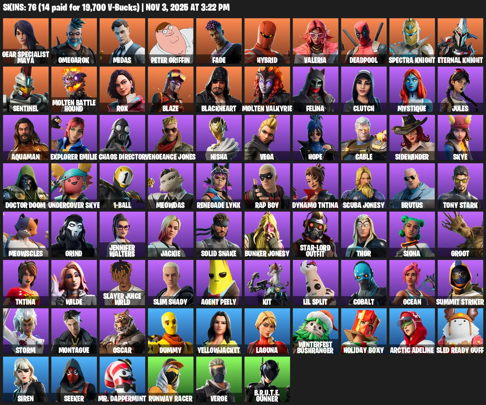 [PC/PSN/XBOX] | 76 skins | Gear Specialist Maya | Omegarok | Midas | Peter Griffin | Fade | Hybrid | Valeria | Deadpool | #FJJ3412 | #MBFN