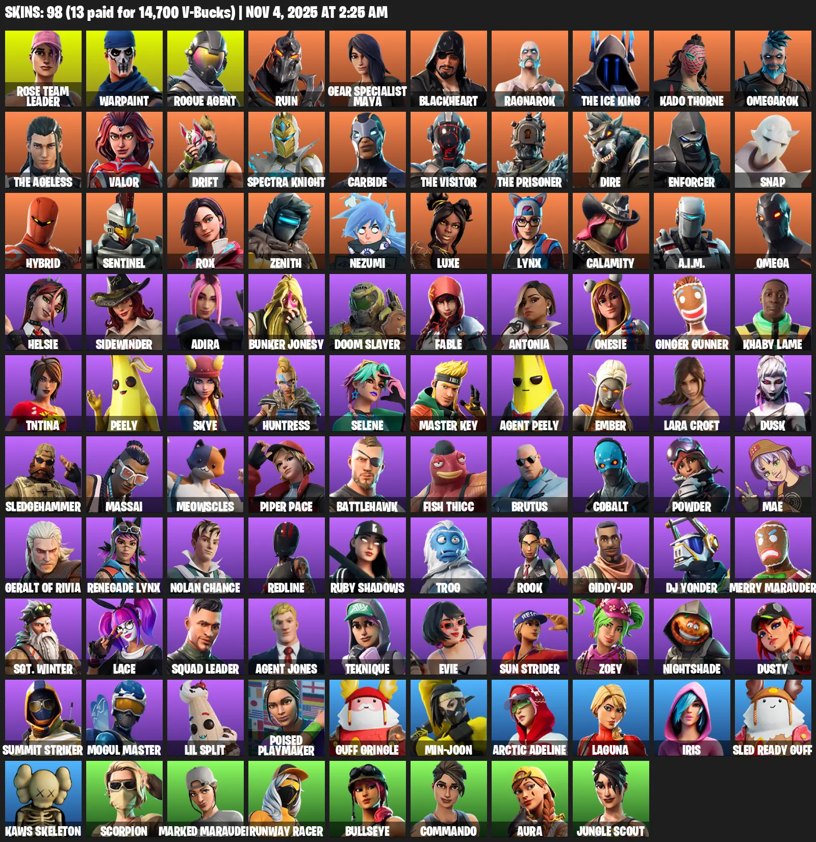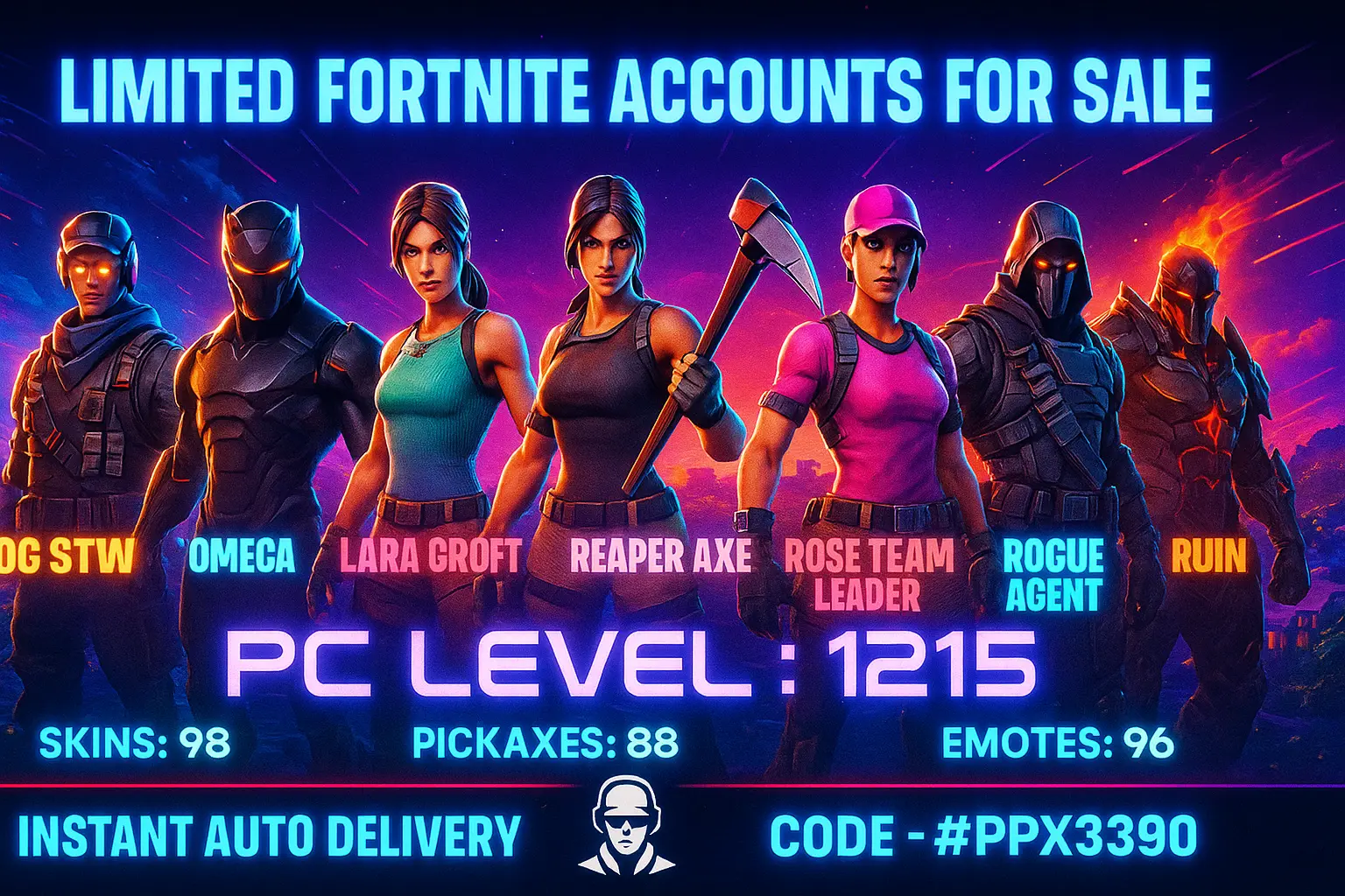 [PC/PSN/XBOX] | 98 skins | OG STW | Omega | Lara Croft | Reaper Axe | Rose Team Leader | Warpaint | Rogue Agent | Ruin | #PPX3390 | #MBFN