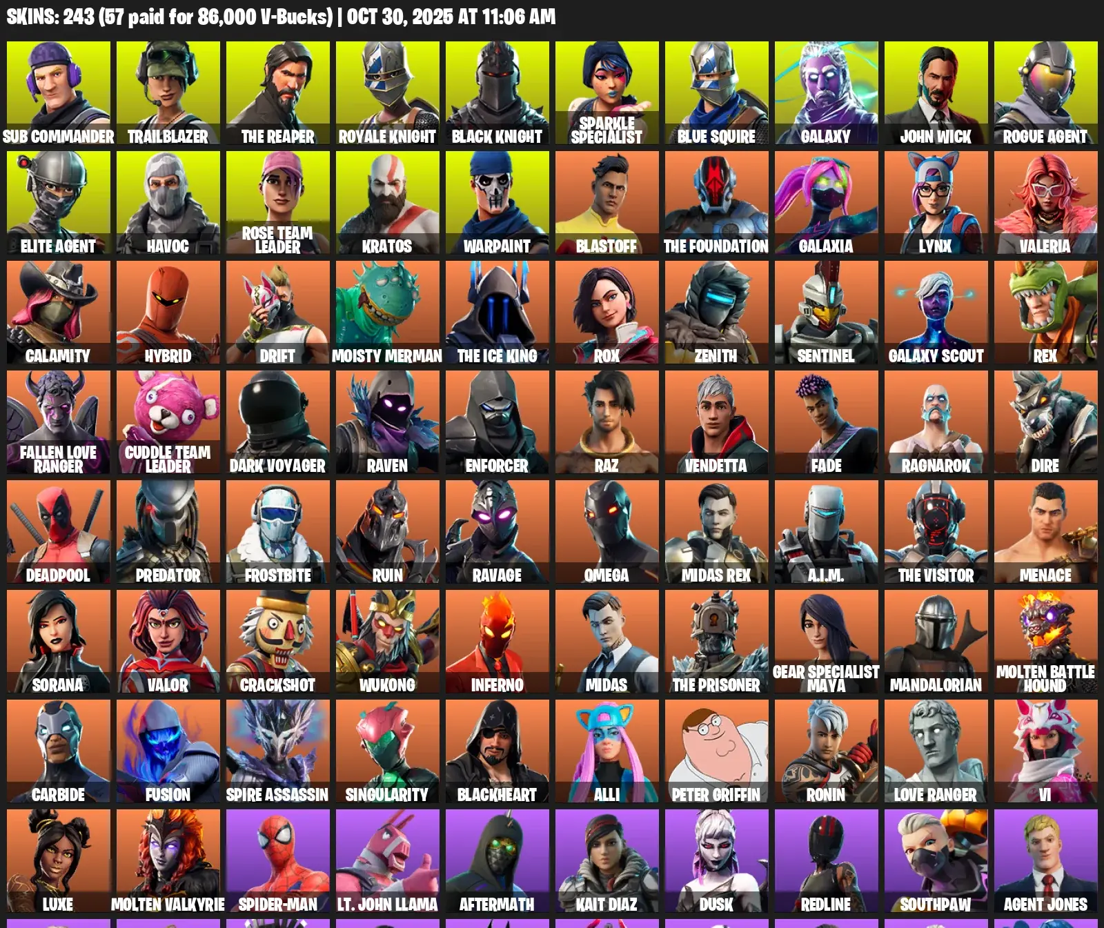 [PC/XBOX/PSN] 243 Skins | Sub Commander | Trailblazer | The Reaper | Royale Knight | Black Knight | Sparkle Specialist | Blue Squire | Galaxy | John Wick | Rogue Agent | Elite Agent | Havoc | Rose Team Leader | Kratos | Warpaint | Blastoff