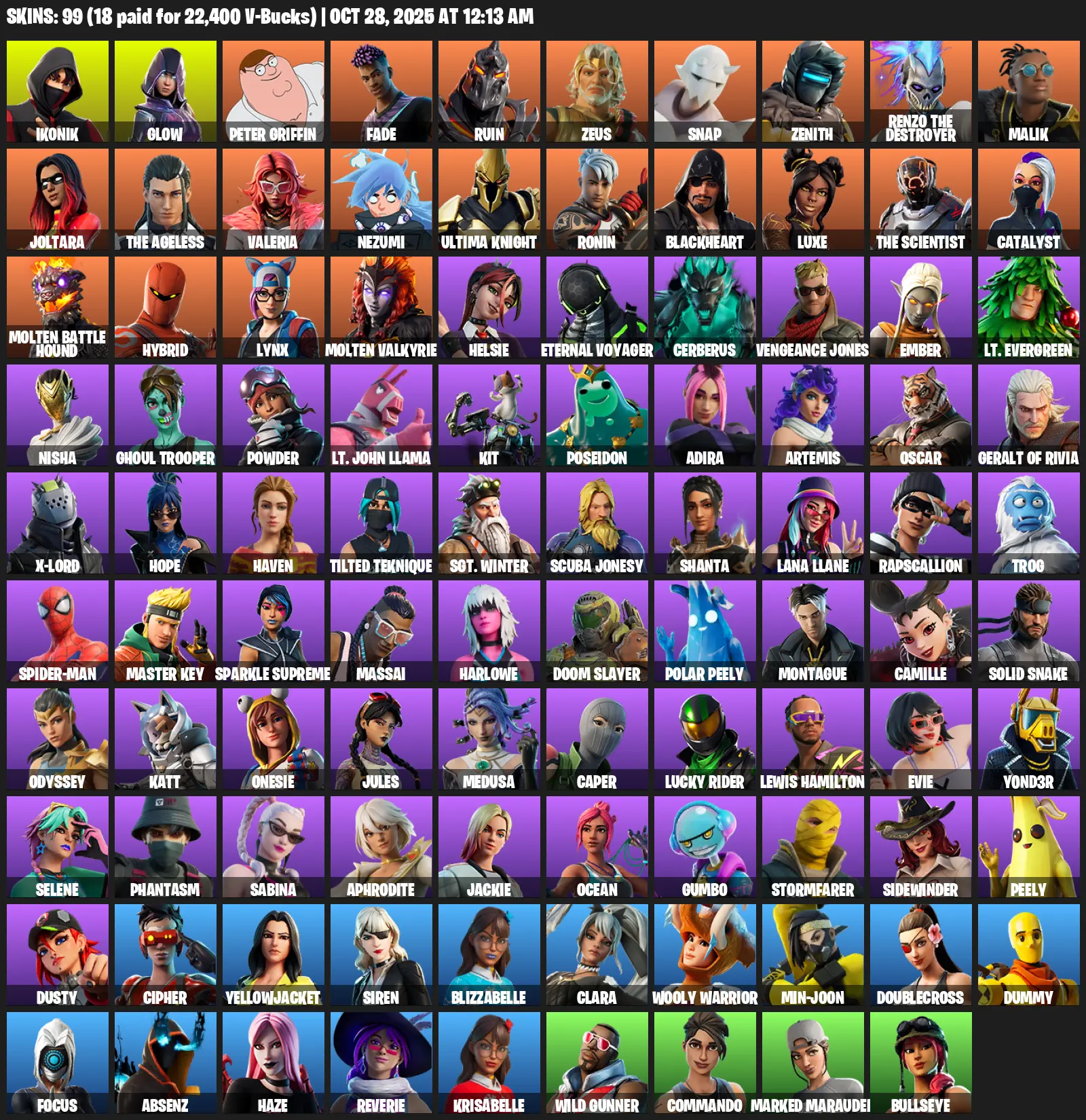 [PC/XBOX/PSN] 99 Skins | IKONIK | Glow | Peter Griffin | Fade | Ruin | Zeus | Snap | Zenith | Renzo the Destroyer | Malik | Joltara | The Ageless | Valeria | Nezumi | Ultima Knight | Ronin | Blackheart | Luxe | The Scientist | Catalyst