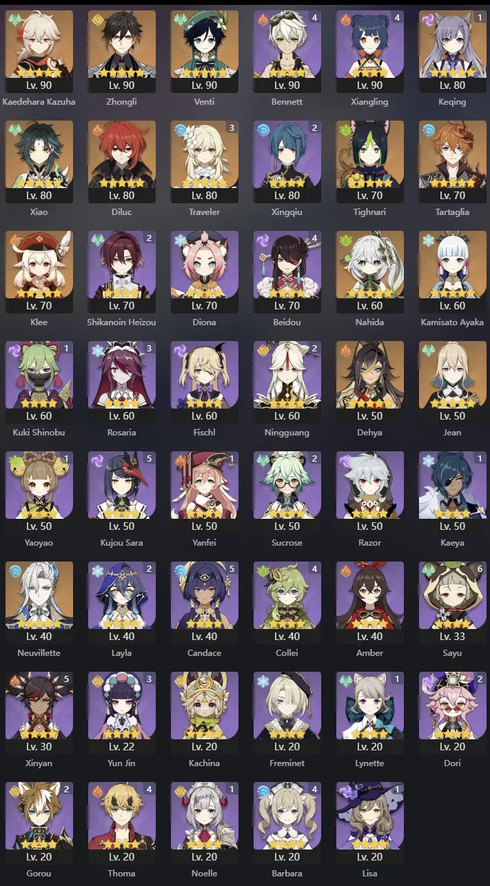 NA | AR 55 | 14 + 3 Leg | Kazuha | Venti | Zhongli | Xiao | Tighnari | Klee | Ayaka | Nahida | Neuvillette | Dehya | Jean | Diluc | Tartaglia | Keqing C1
