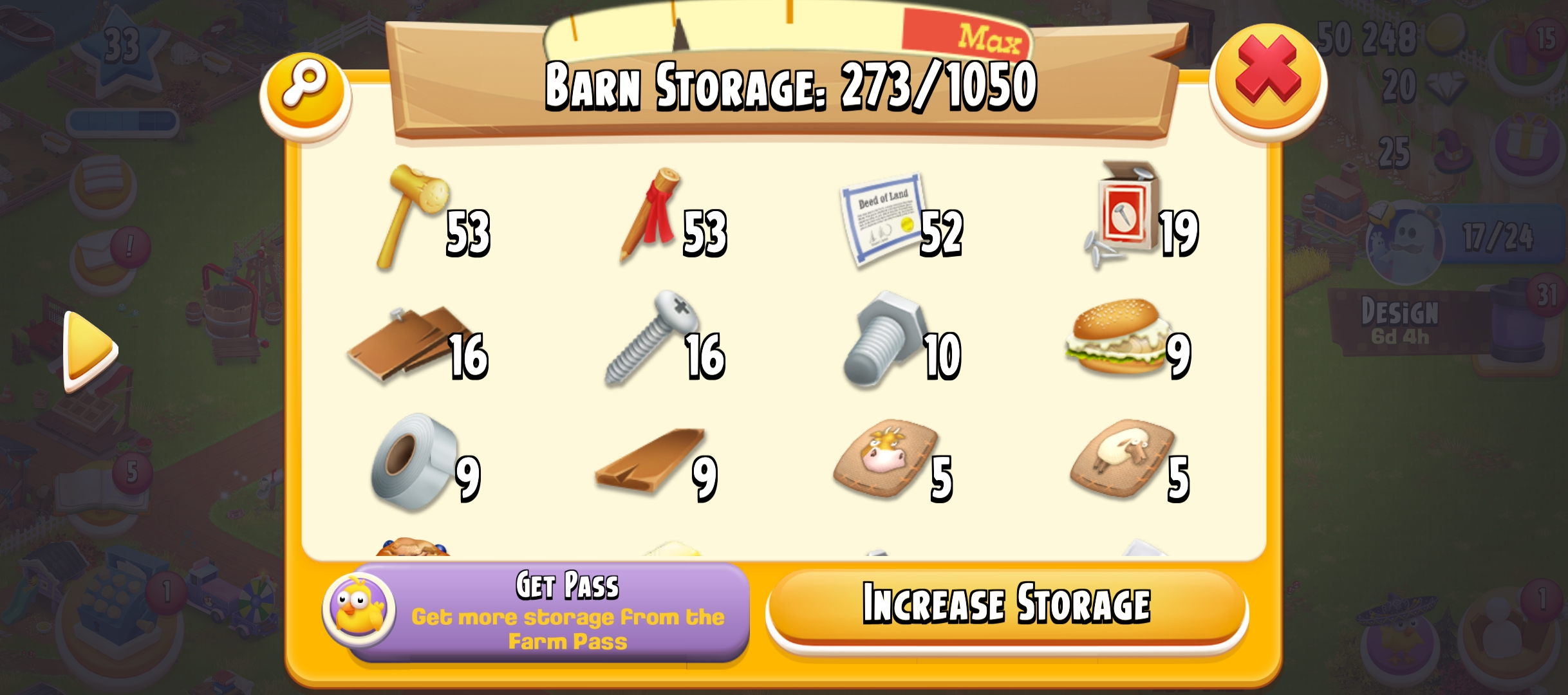 33 level | 1050 Barn storage | 550 Silo Storage | 50k Coin | 20 gems