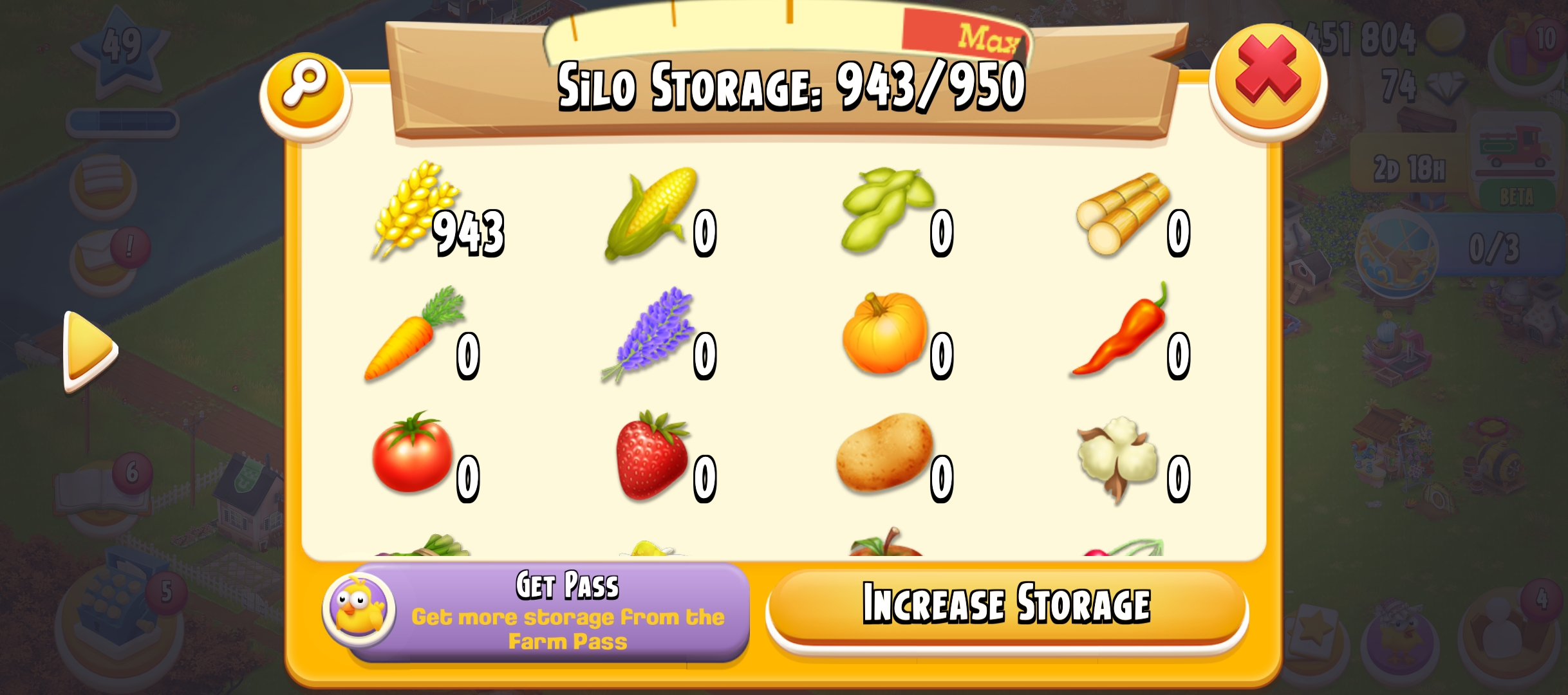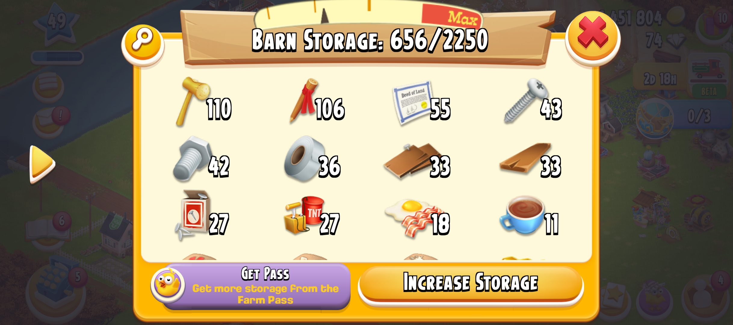 49 level | 2250 Barn Storage | 950 Silo Storage | 1.4 M Coin | 74 gems | Android & Ios