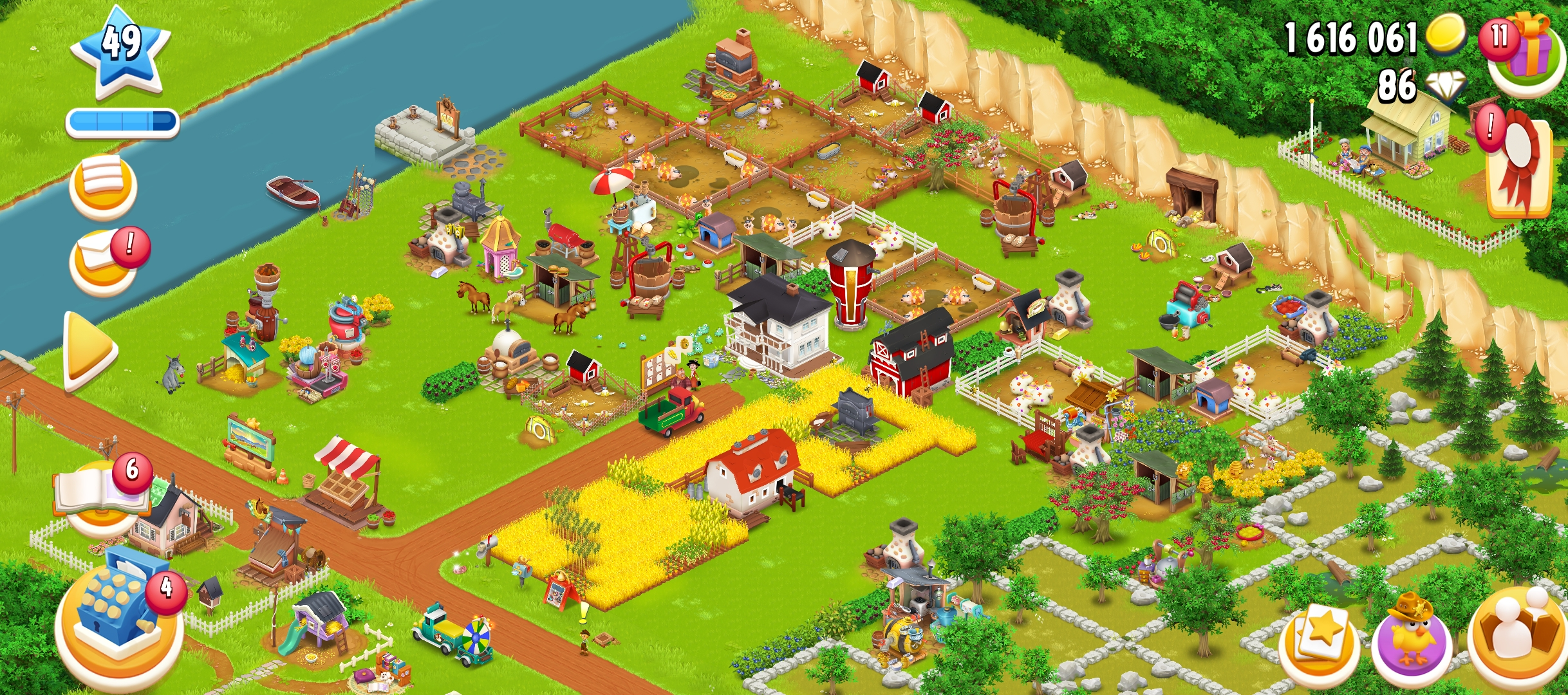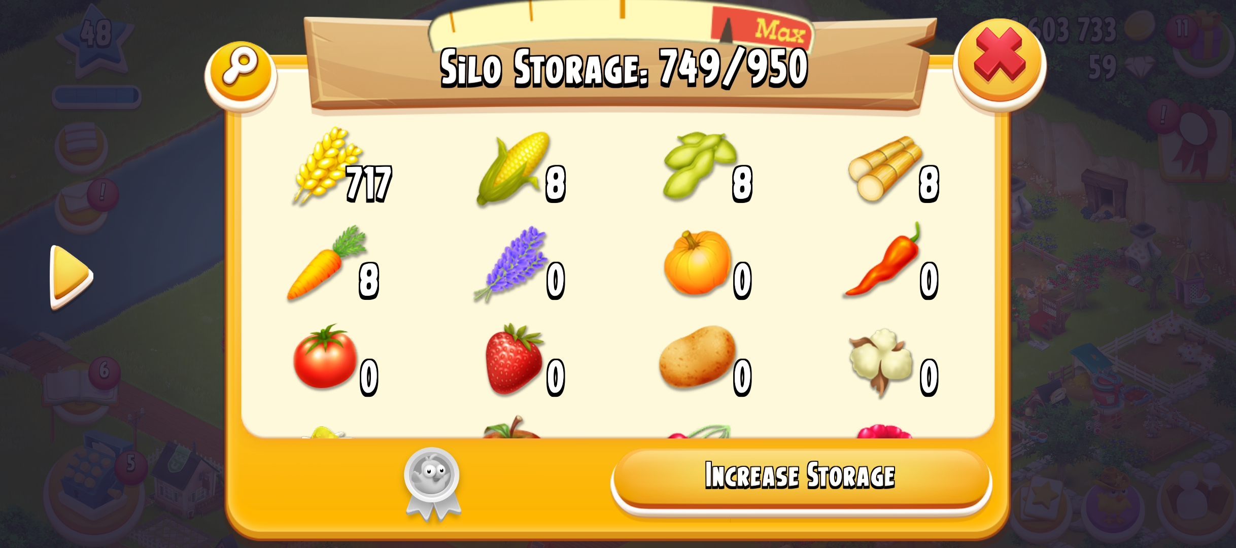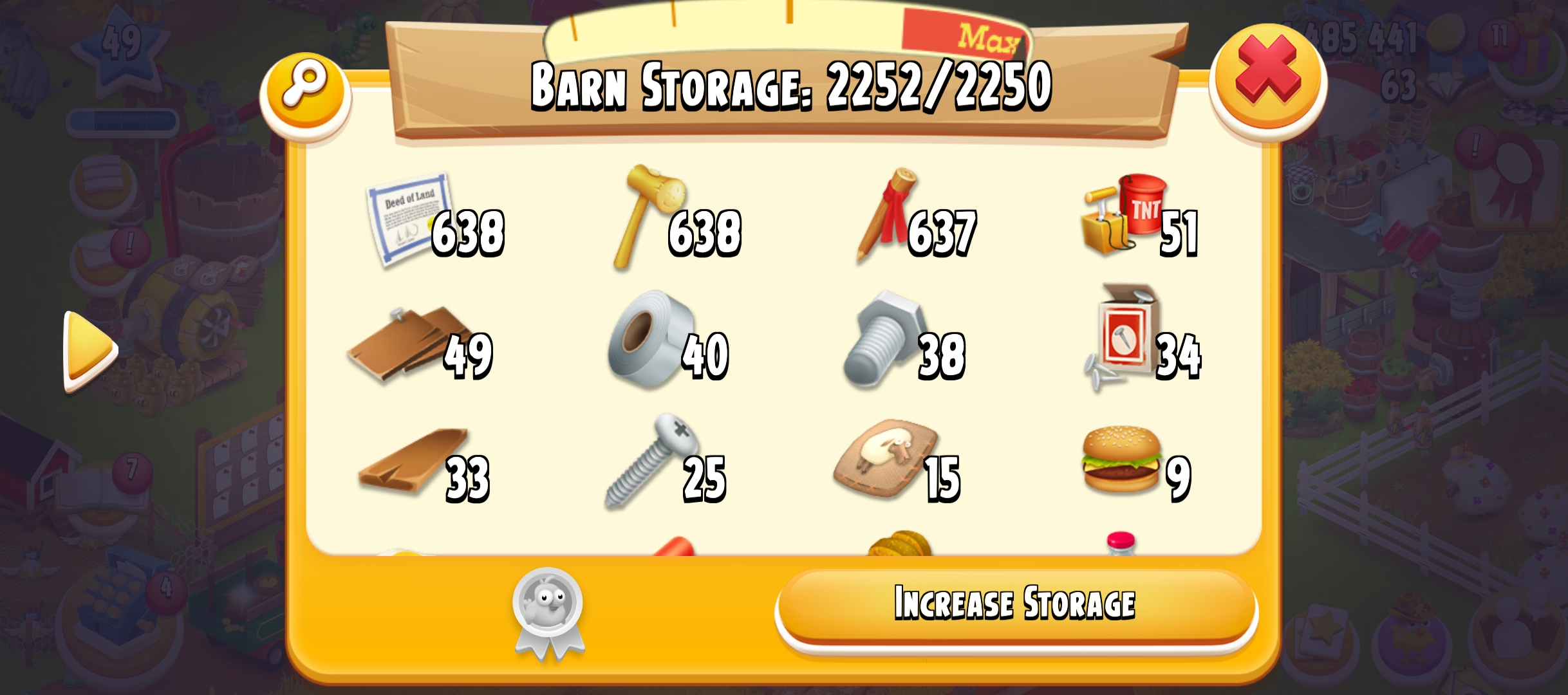 Level 49 | Barn Storage 2250 | Silo Storage 950 | land Tools | Land items | 1.4M Coin | 50 gems