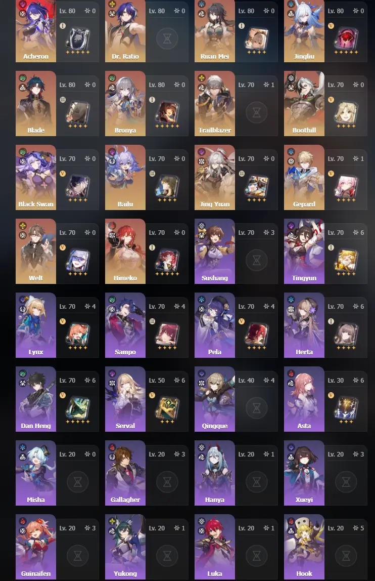 EU | TL 70 | 13 + 5 Leg | Gepard C1 | Acheron | Ruan Mei | Jingliu | Blade | Bronya | Dr. Ratio | Himeko | Welt | Bailu | Jing Yuan | Black Swan | Boothill