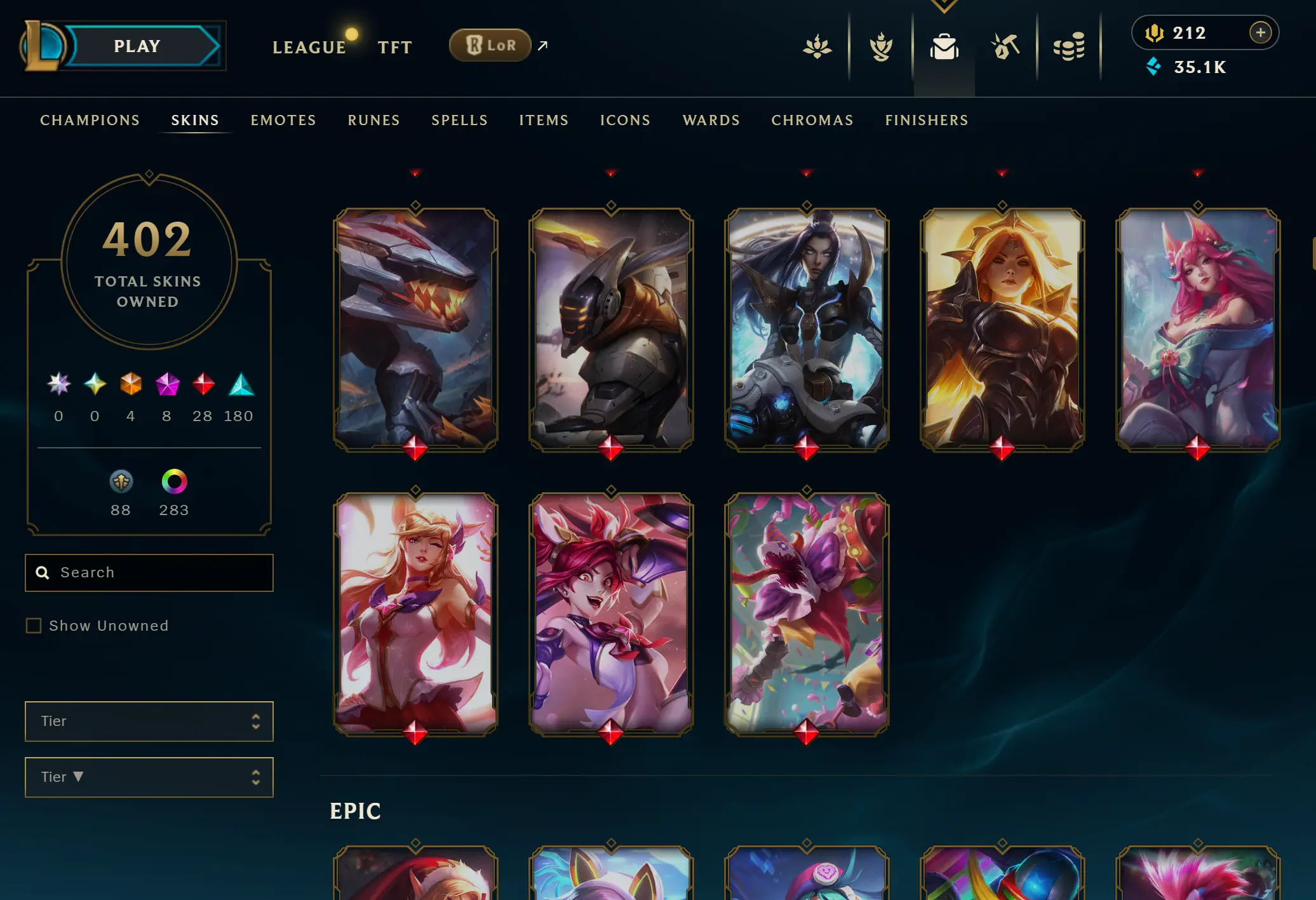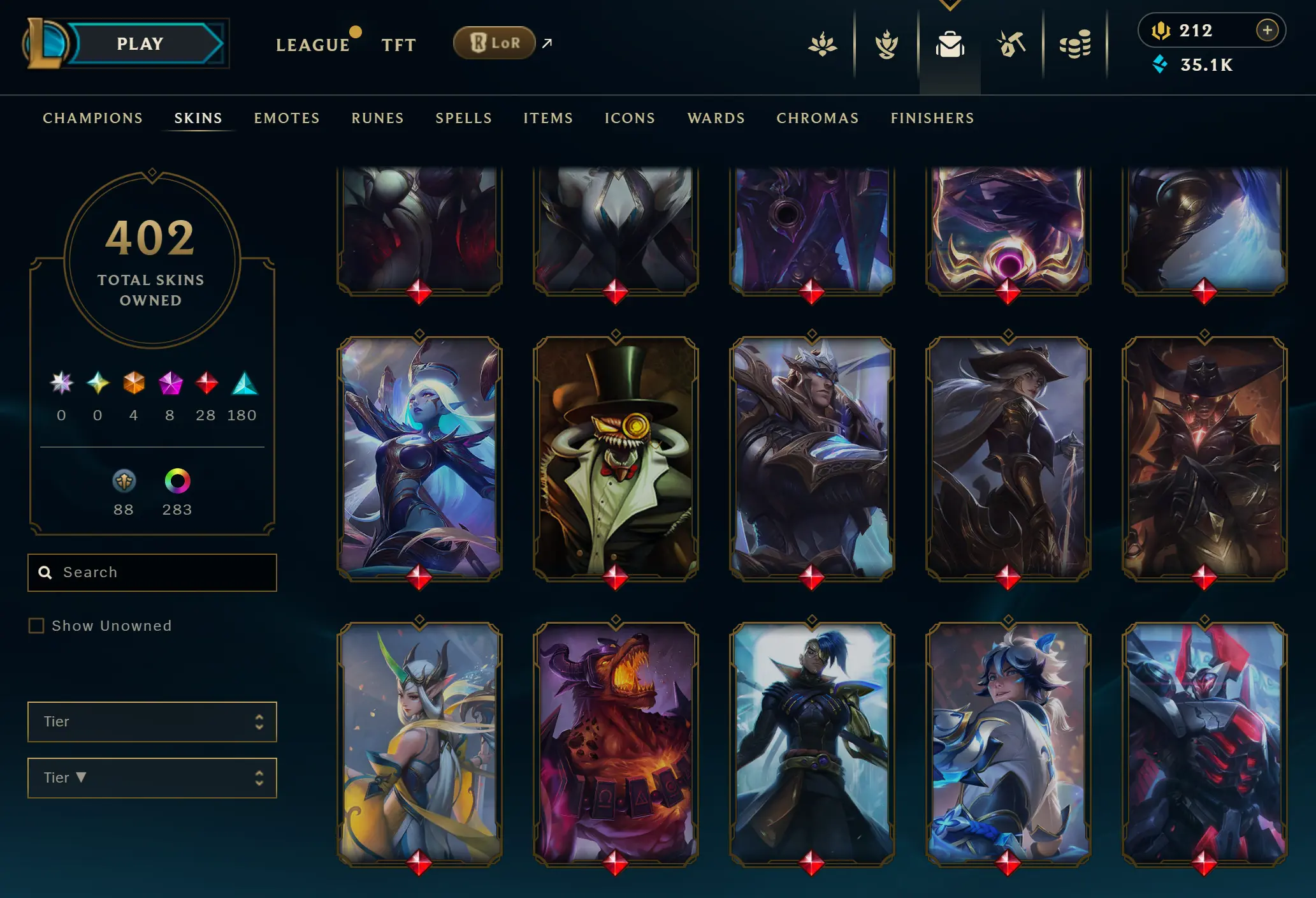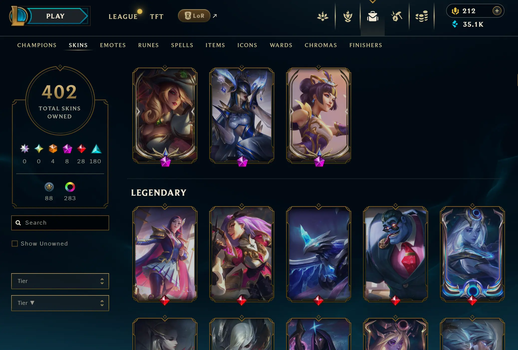 EUW 402 skins | 169 champions | Grey Warwick, Victorious Skins, DJ Sona, Elementalist Lux, High Noon Thresh, Spirit Blossom Ahri