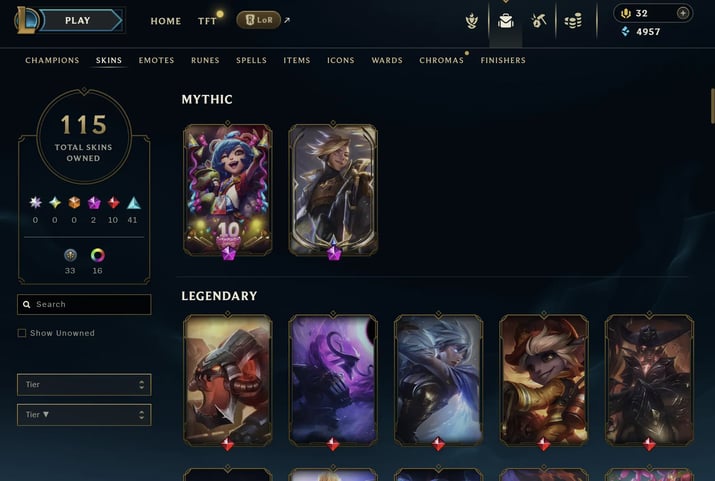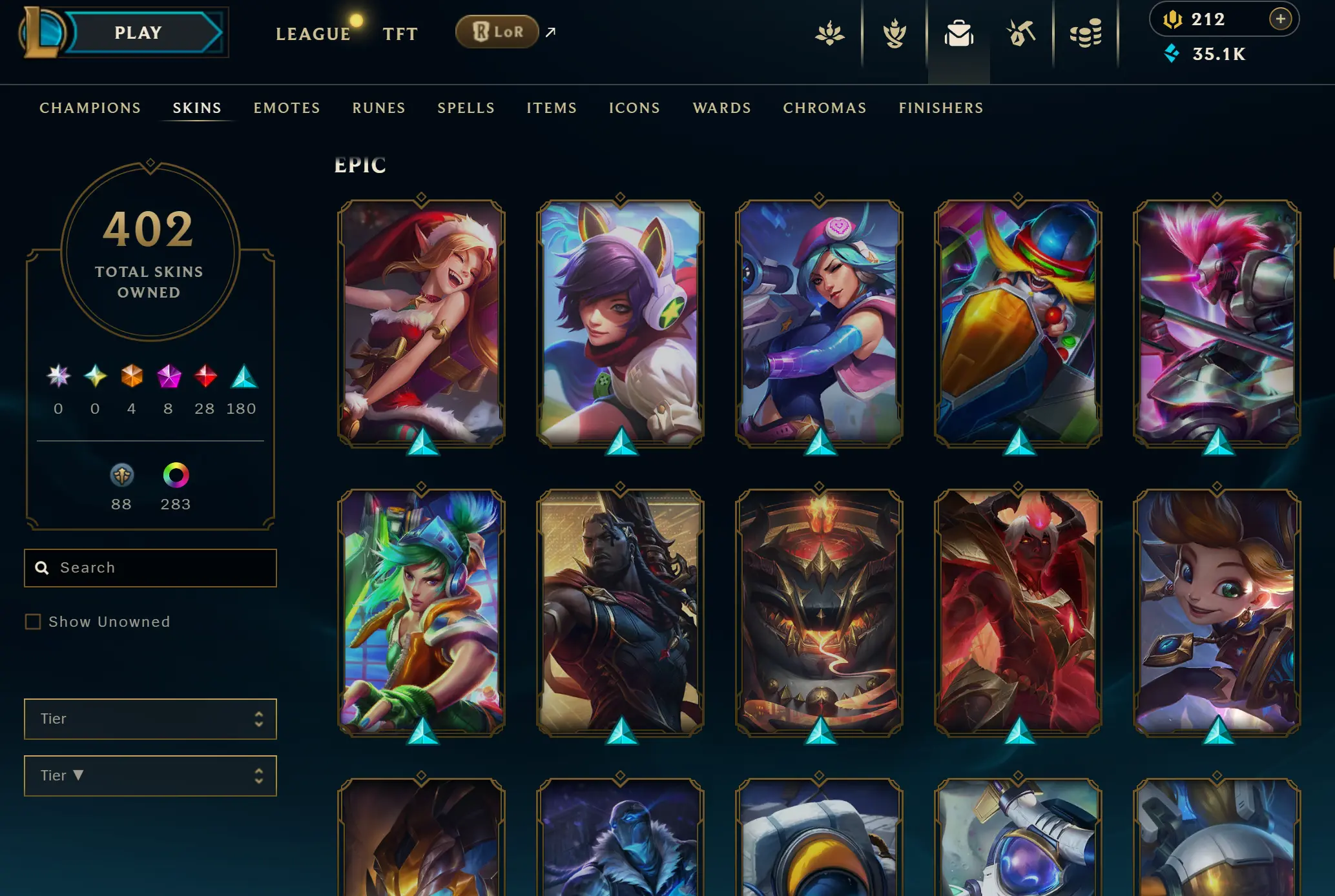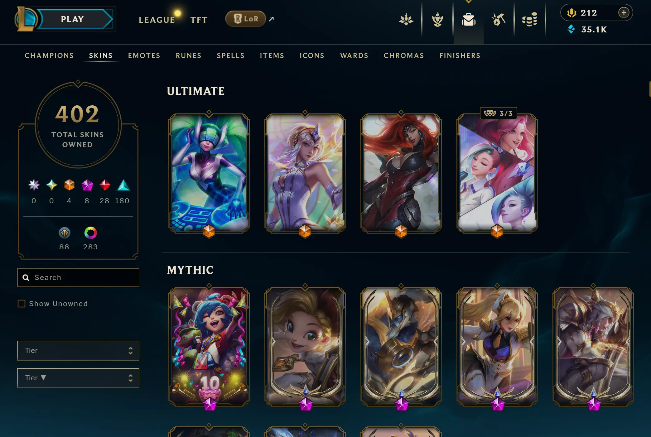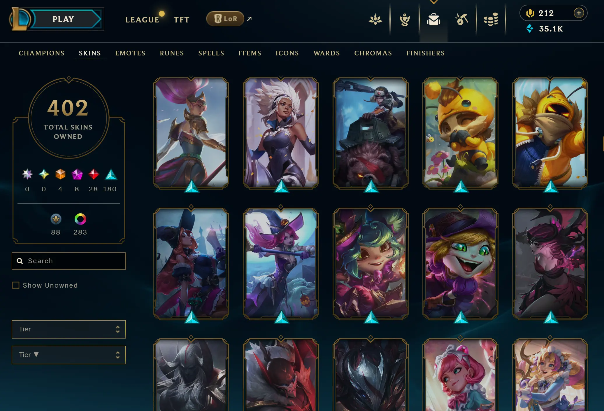 EUW 402 skins | 169 champions | Grey Warwick, Victorious Skins, DJ Sona, Elementalist Lux, High Noon Thresh, Spirit Blossom Ahri