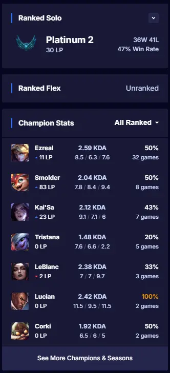 [EUW] Platinum 2 | 🔥 47% Winrate | 💙 33k BE | 🎭 Winterblessed Sylas + 7 Skins Shards