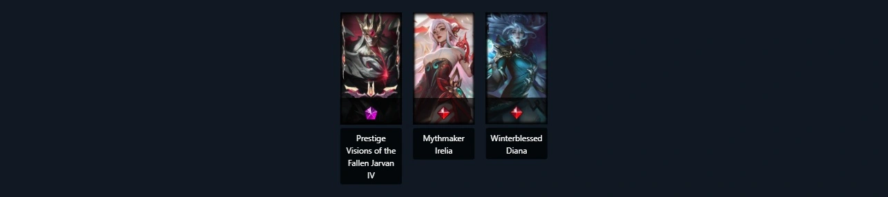 UnRanked┃18 skins┃58 Champs┃(1 Prestige) Prestige Visions of the Fallen Jarvan IV Mythmaker Irelia Winterblessed Diana Trick or Treat Ekko Three Honors Shen Winterblessed Hecarim High Noon Irelia