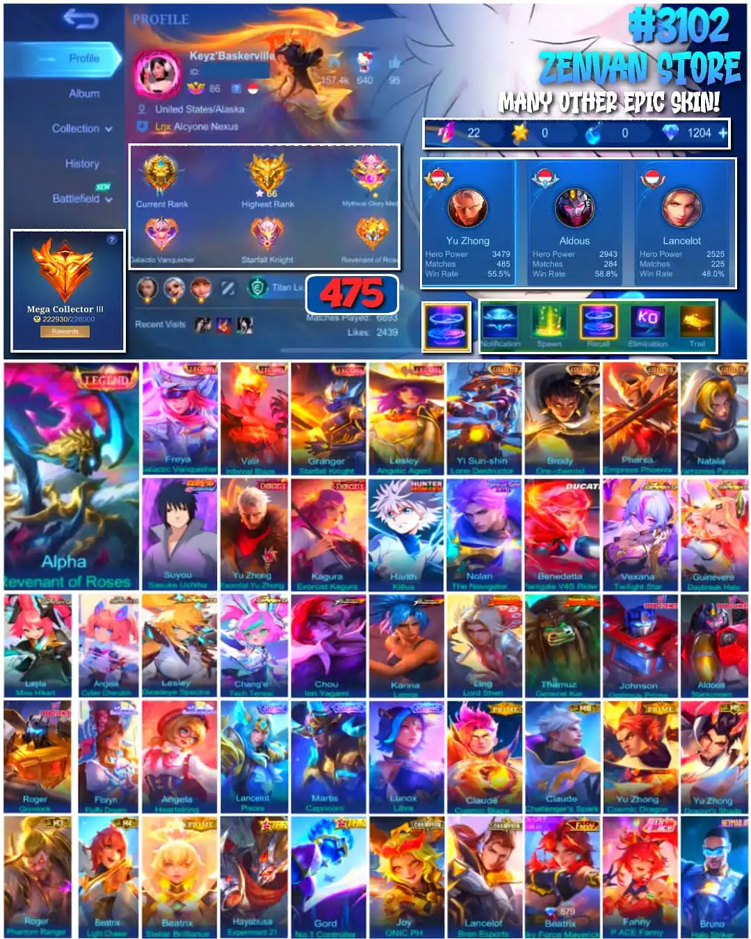 #3102 🔥 475 Skins 🔥 Legend Alpha, Freya, Valir, Granger & Lesley 🔥 Collector Yin Sun Shin, Brody, Pharsa & Natalia 🔥 Sasuke 🔥 Exorcist Yu Zhong & Kagura 🔥 Killua 🔥 Many Limited 🔥 Many Epic 🔥 Safe Account ✅