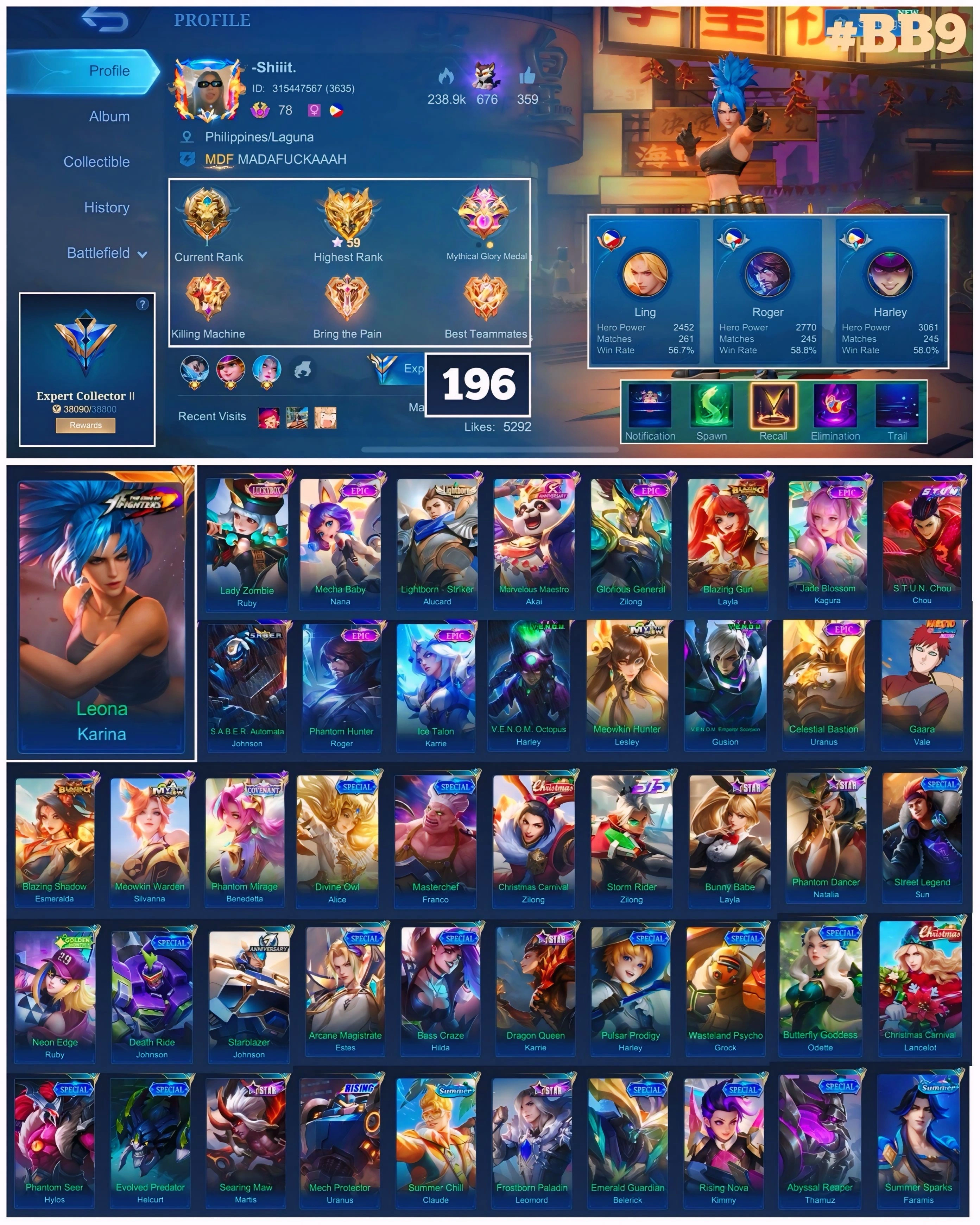 BB9💎Skin 196💎Hero 120💎Full Max Emblem💎Kof Karina💎Luckybox Ruby💎6 Epic💎Lightborn Alucard💎Blazing Layla💎Stun Chou💎Venom Harley Gusion💎Mystic Lesley Silvanna💎Naruto Vale💎Covenant Benedetta💎