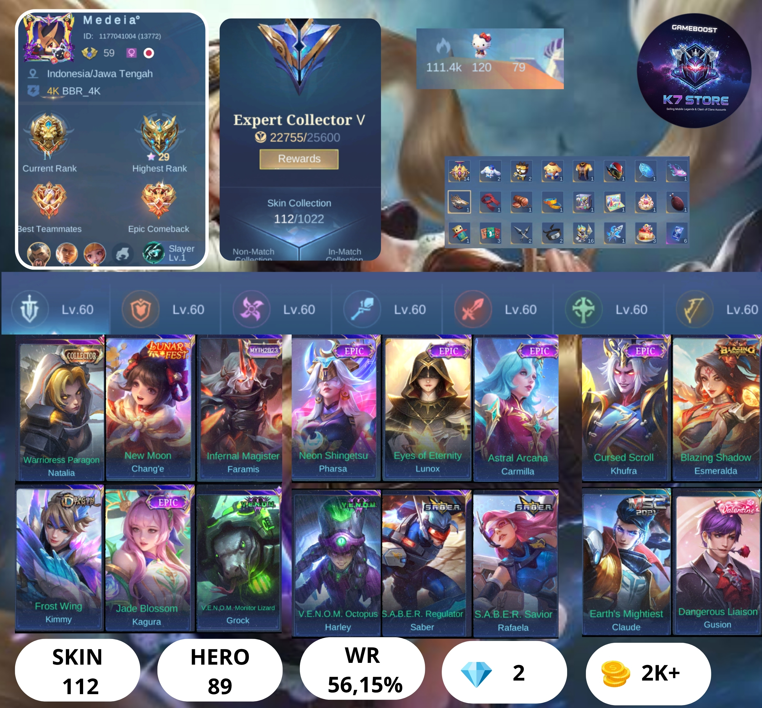 BEST MEGA DEAL✨HERO 89✨SKIN 112✨NATALIA CC✨ CHANGE LUNAR FEST✨FARAMIS MYTH✨PHARSA NEON SHINGETSU✨ESME BLAZING✨S.A.B.E.R 2 ✨VENOM 2 ✨KAGURA JADE BLOSOM ✨CLAUDE MSC✨SAFE ACC✨INSTAN DELIVERY