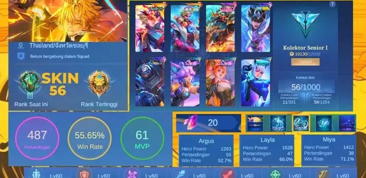 ML268 56 skins and holds the Kolektor Senior I title (19130/22000). Total matches are 487 with a 55.65% Win Rate and 61 MVP awards (G)