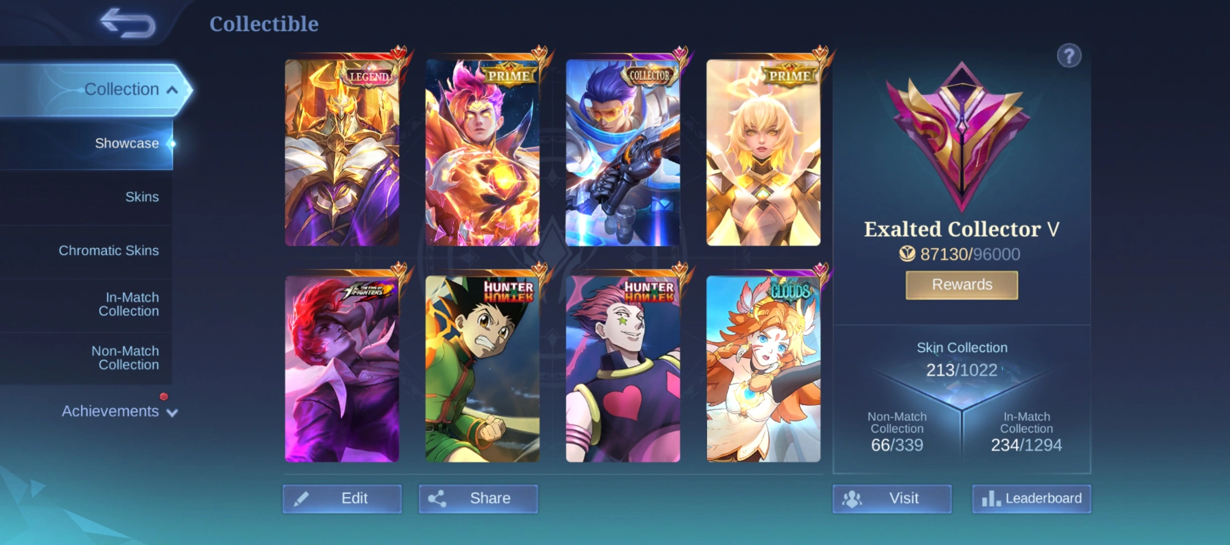 N275|LV 66|EXALTED COLLECTOR V|213 SKIN|JOHNSON LEGEND|2 HXH(DYRROTH,CECILION)2 PRIME(CLAUDE,BEATRIX)2 KOF(CHOU,KARINA)2 CLOUDS