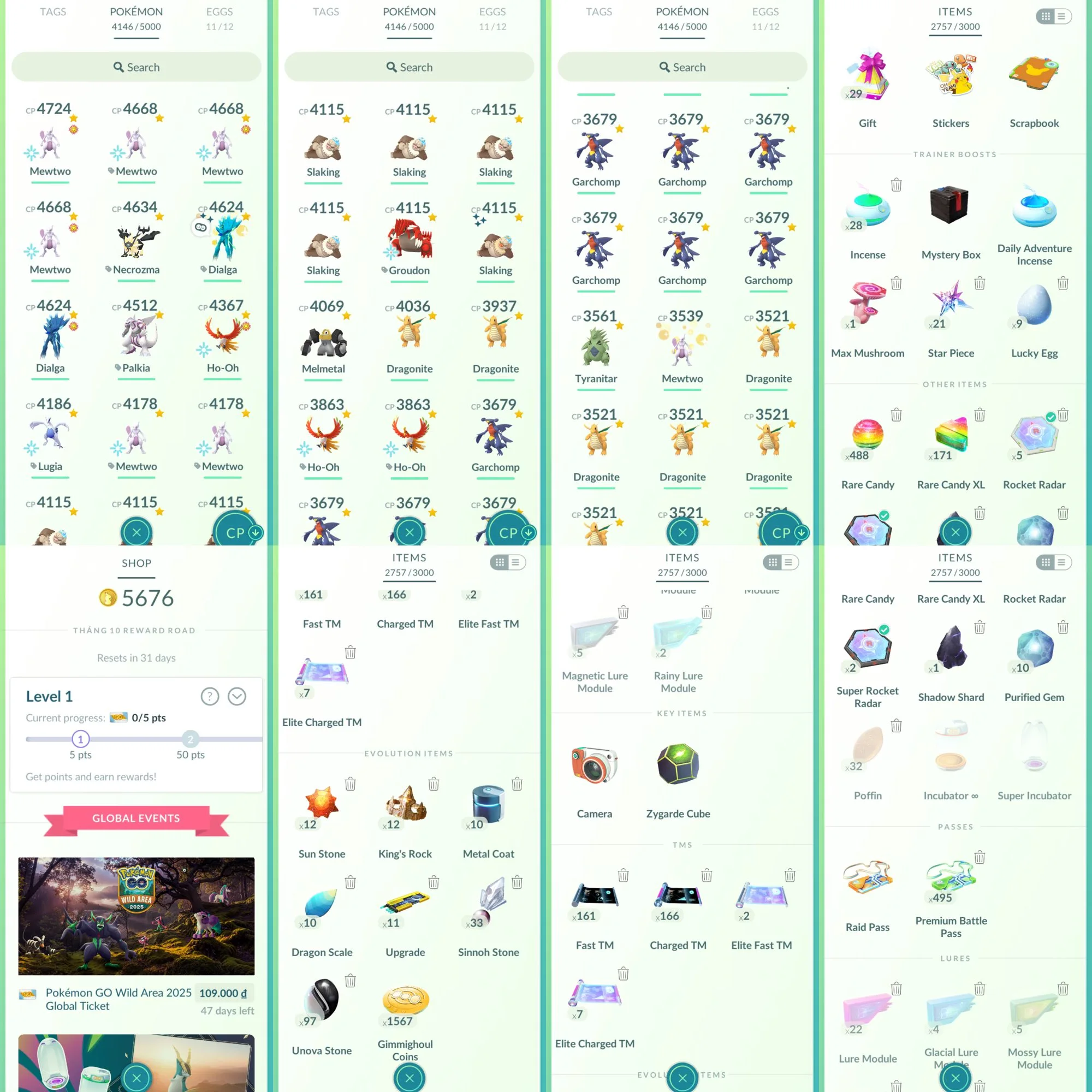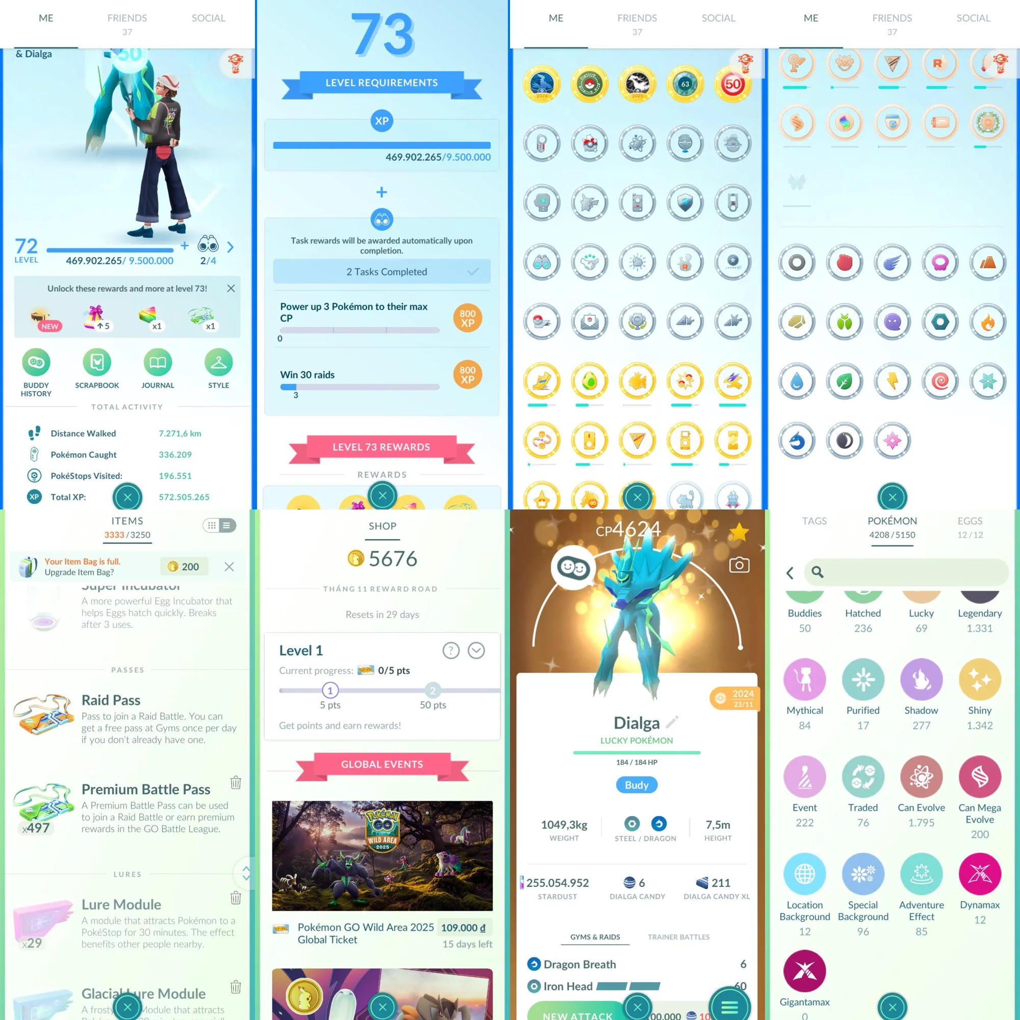 Level 72+ -42 legend iv100-496 pass-5676 Coins-Shundo Dialga Origin-5 Shundo Legend-255m+ Stardust-1455 legend-1342 shiny-1017 Hundo-572m+ XP-222 costume-Pose level 50