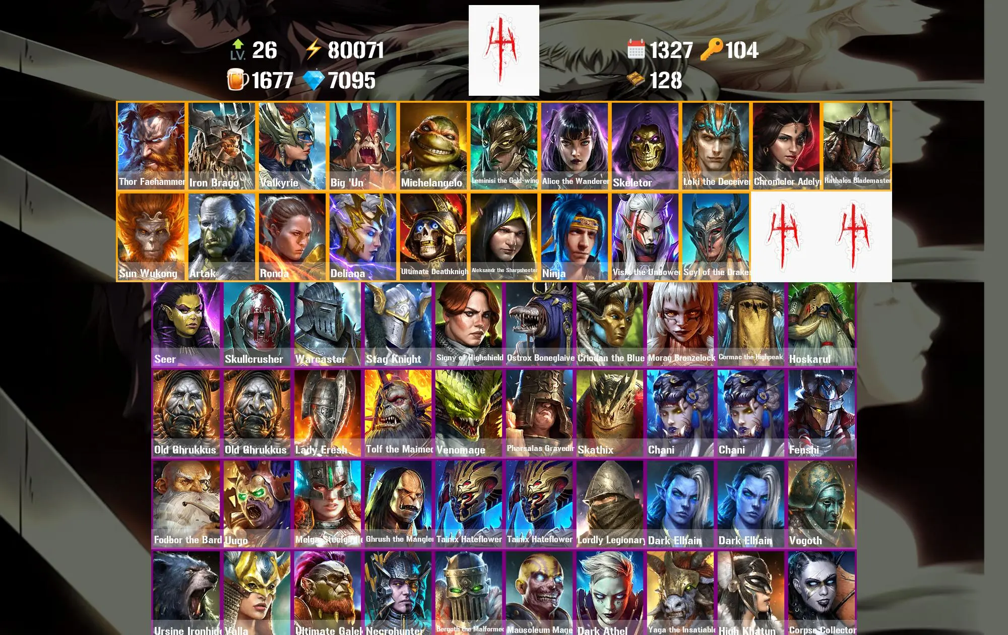 1327 Days 80.1k Energy Thor Faehammer ⸱ Iron Brago ⸱ Valkyrie ⸱ Big 'Un ⸱ Michelangelo ⸱ Seer ⸱ Skullcrusher ⸱ 52.2m Silver ⸱ 7.1k Gems