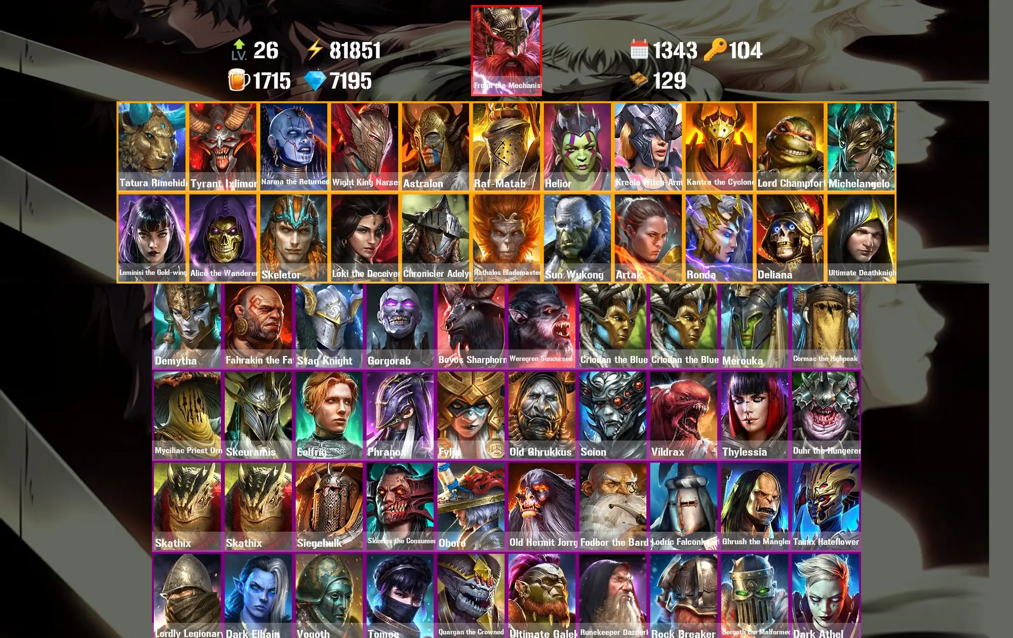 1343 Days 81.9k Energy [Mythical Starter] Frolni the Mechanist ⸱ Tatura Rimehide ⸱ Tyrant Ixlimor ⸱ Narma the Returned ⸱ Wight King Narses ⸱ Astralon ⸱ Demytha ⸱ Fahrakin the Fat ⸱ 53.1m Silver ⸱ 7.2k Gems