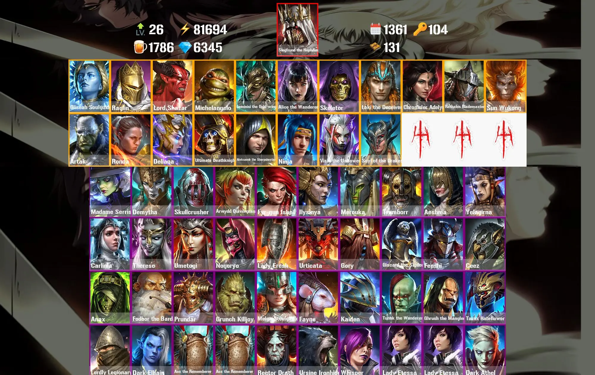 1361 Days 81.7k Energy [Mythical Starter] Siegfrund the Nephilim ⸱ Gliseah Soulguide ⸱ Raglin ⸱ Lord Shazar ⸱ Michelangelo ⸱ Leminisi the Gold-wing ⸱ Madame Serris ⸱ Demytha ⸱ 51.2m Silver ⸱ 6.3k Gems