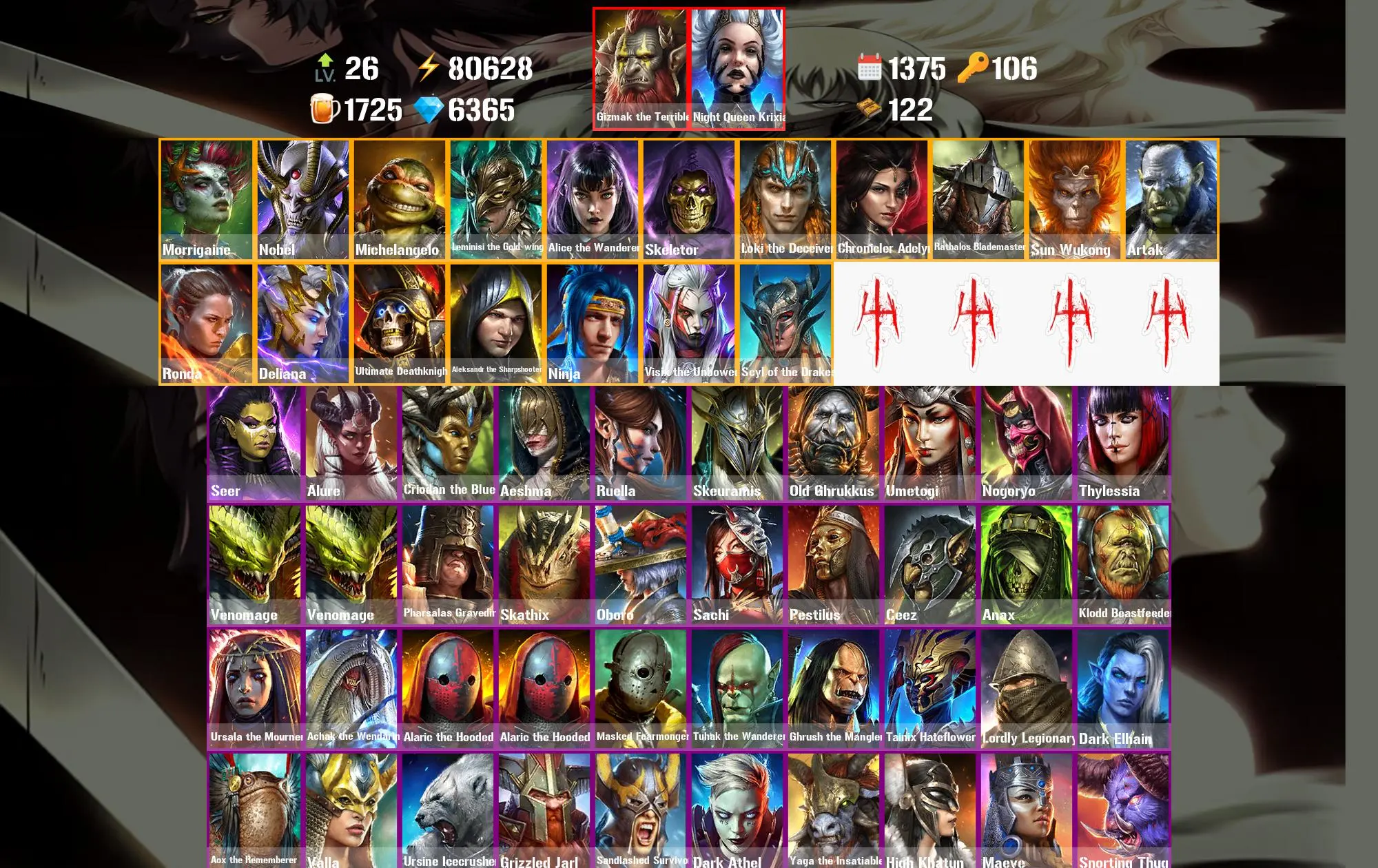 1375 Days 80.6k Energy [Mythical Starter] Gizmak the Terrible ⸱ Night Queen Krixia ⸱ Morrigaine ⸱ Nobel ⸱ Michelangelo ⸱ Leminisi the Gold-wing ⸱ Alice the Wanderer ⸱ Seer ⸱ Alure ⸱ 53.2m Silver ⸱ 6.4k Gems