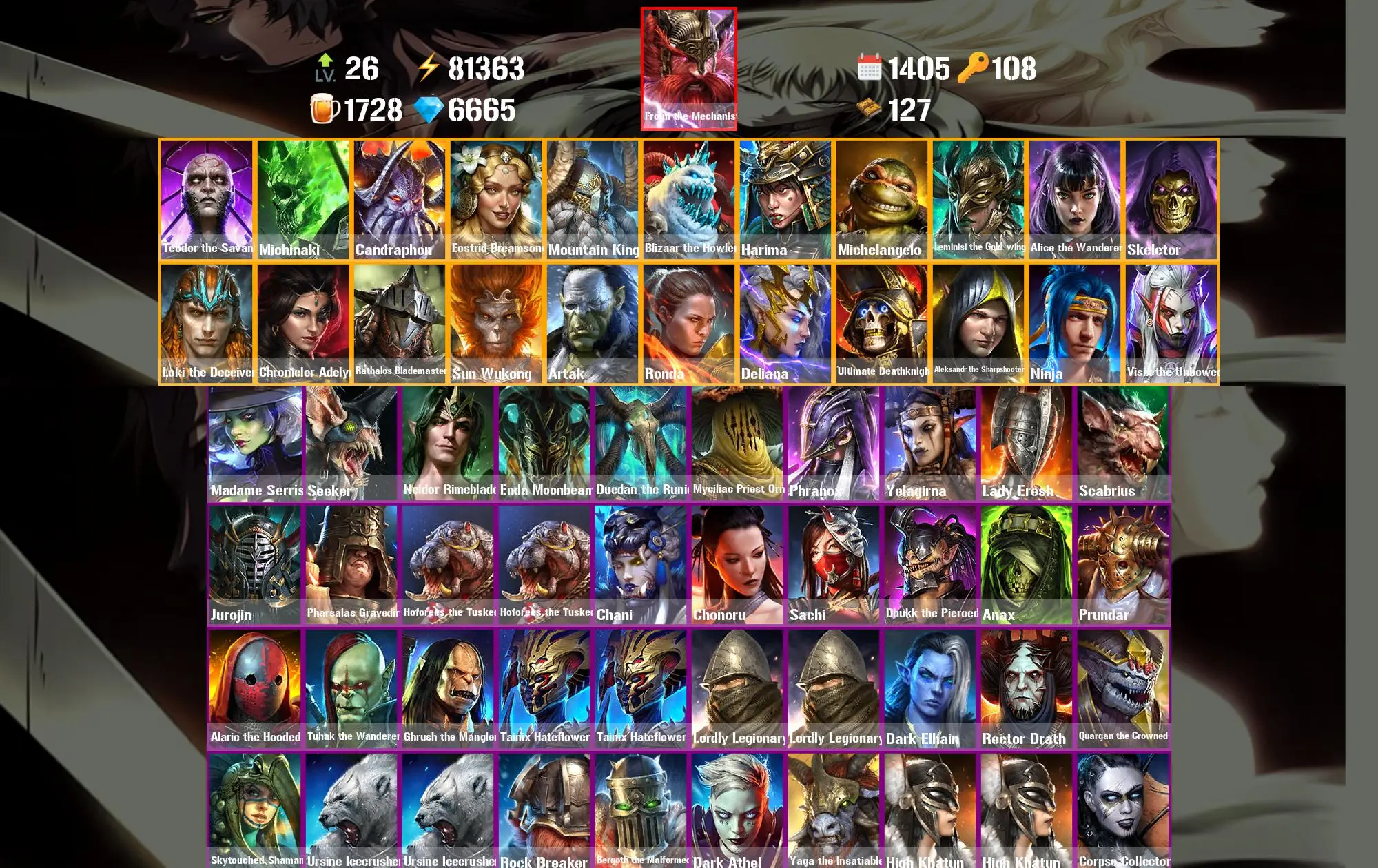 1405 Days 81.4k Energy [Mythical Starter] Frolni the Mechanist ⸱ Teodor the Savant ⸱ Michinaki ⸱ Candraphon ⸱ Eostrid Dreamsong ⸱ Mountain King ⸱ Madame Serris ⸱ Seeker ⸱ 47.2m Silver ⸱ 6.7k Gems