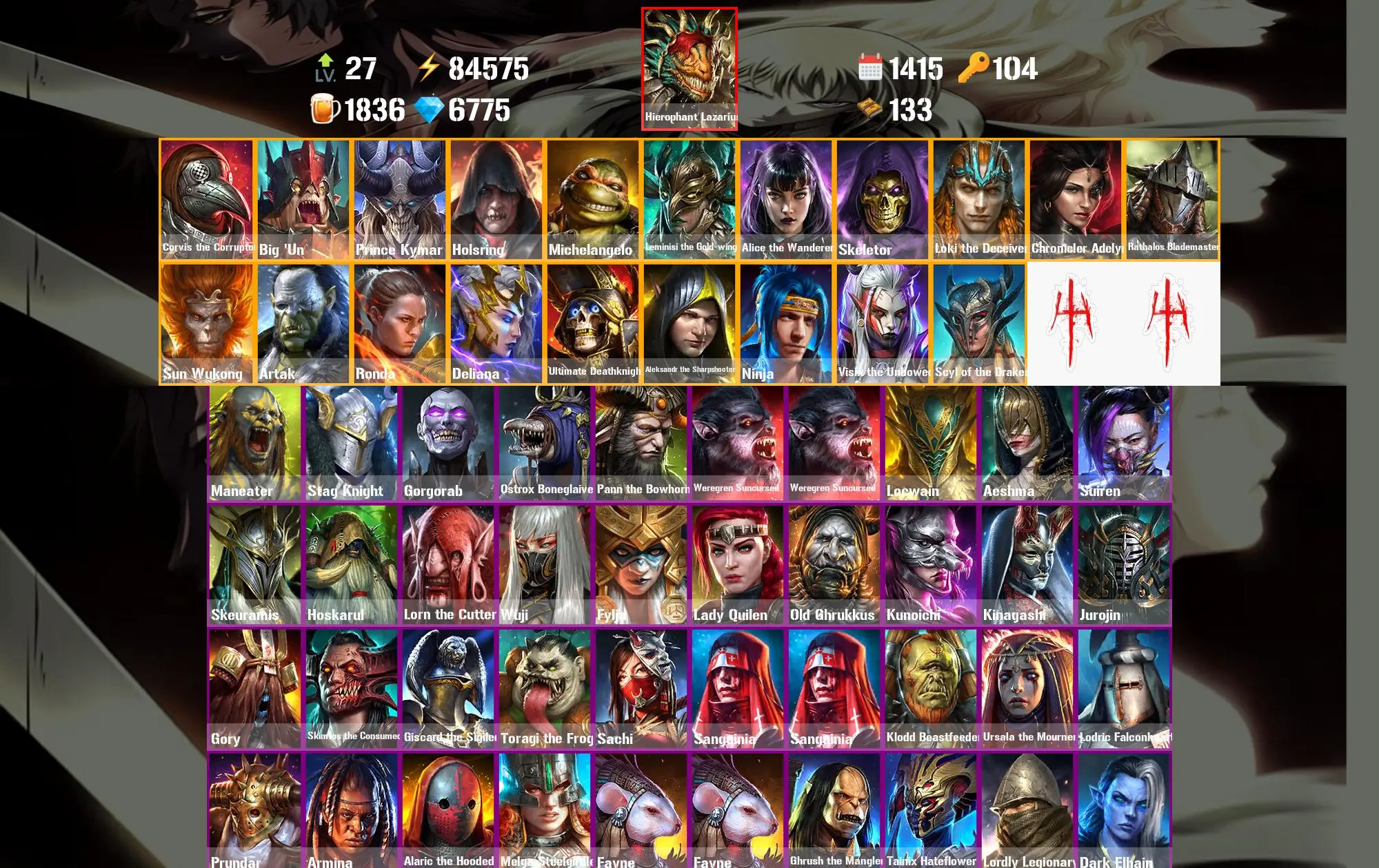 1415 Days 84.6k Energy [Mythical Starter] Hierophant Lazarius ⸱ Corvis the Corruptor ⸱ Big 'Un ⸱ Prince Kymar ⸱ Holsring ⸱ Michelangelo ⸱ Maneater ⸱ Stag Knight ⸱ 58.1m Silver ⸱ 6.8k Gems