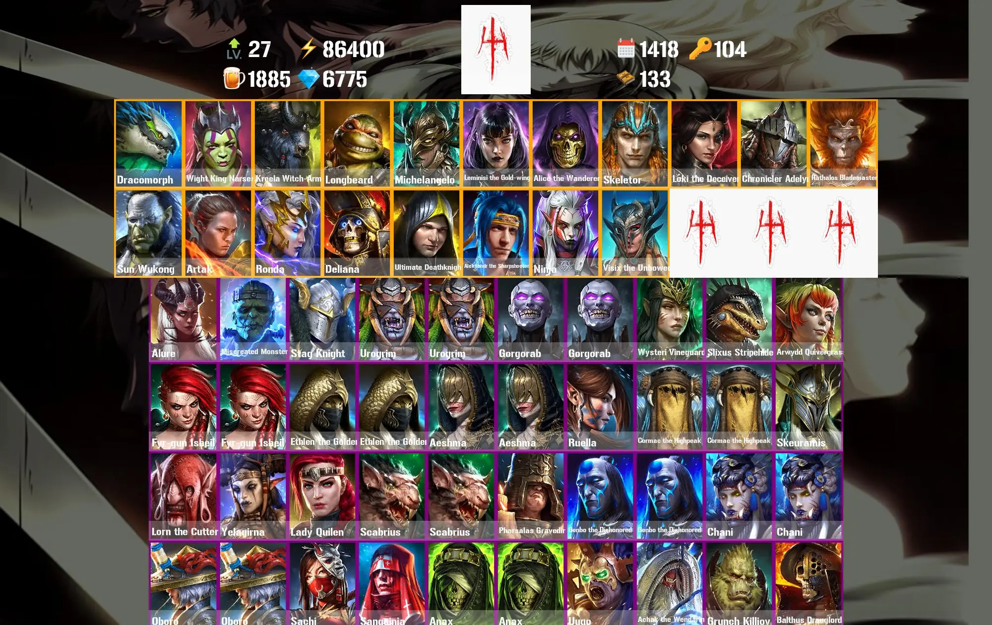 1418 Days 86.4k Energy Dracomorph ⸱ Wight King Narses ⸱ Kreela Witch-Arm ⸱ Longbeard ⸱ Michelangelo ⸱ Alure ⸱ Miscreated Monster ⸱ 55.1m Silver ⸱ 6.8k Gems