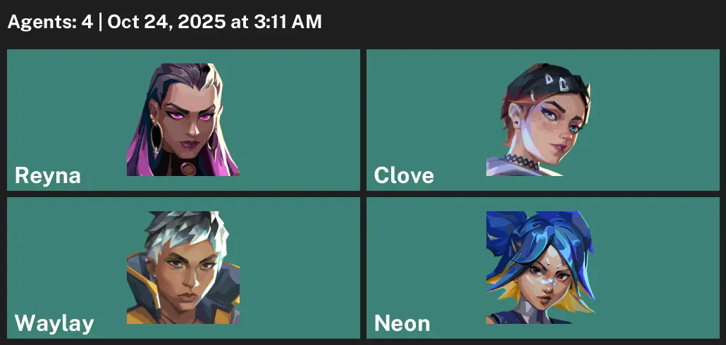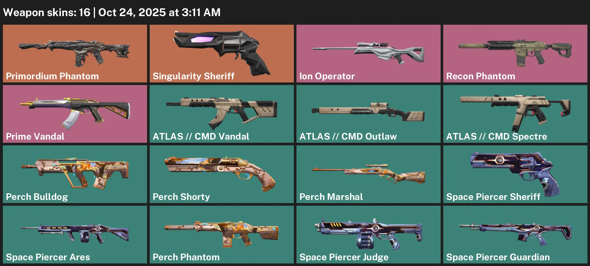 đ AP đȘ« Unranked đ« 16 Skins đ€ 322 VP đł 4 Agents đ§ââïž Value: 9675 VP đ” Primordium Phantom âïž Singularity Sheriff đȘ§ Ion Operator đŠ Recon Phantom đŒ Prime Vandal đœ ATLAS // CMD Vandal