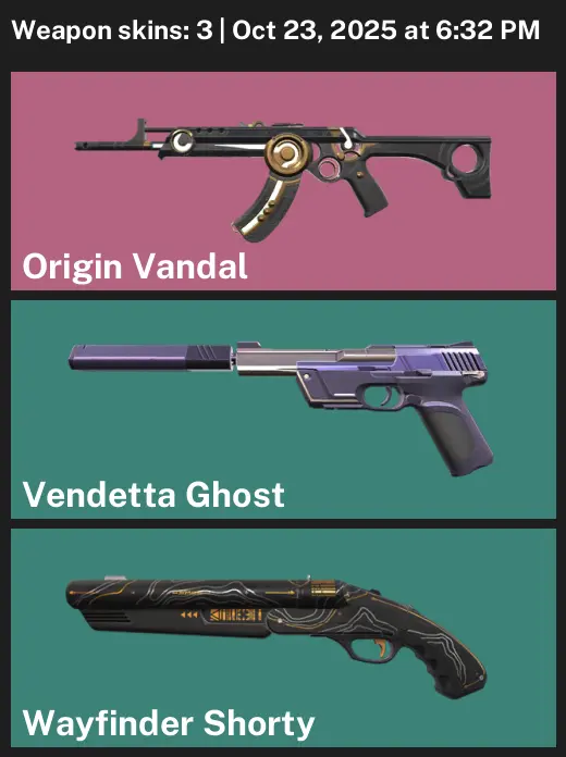 đ AP đ· Unranked đ„ 3 Skins đ 23 VP đ 14 Agents đ„ Value: 1775 VP đ€ Origin Vandal đ Vendetta Ghost đ Wayfinder Shorty