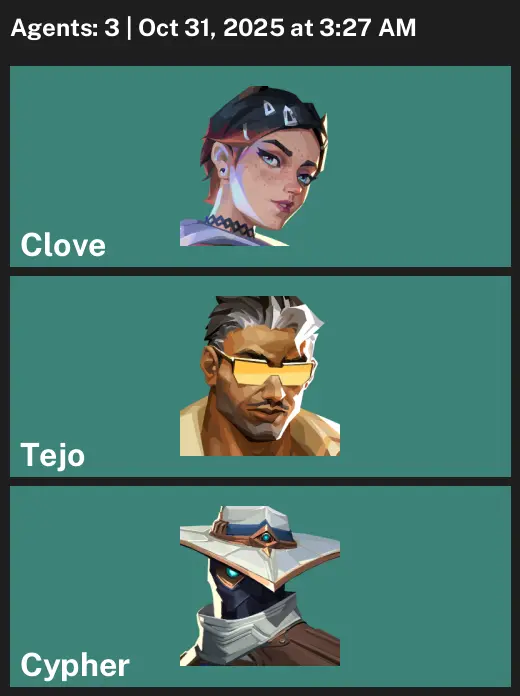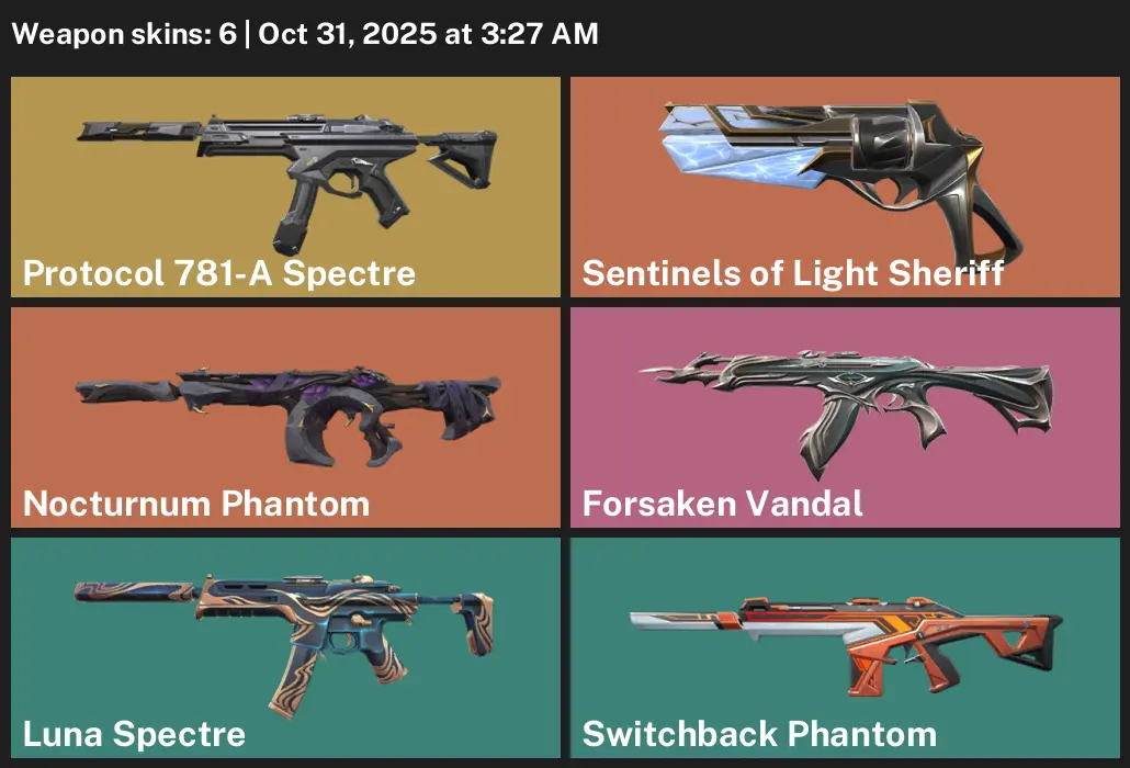 👏 AP 🚆 Unranked 🥜 6 Skins 🥕 236 VP 🫦 3 Agents 🥺 Value: 10750 VP 🛏 Protocol 781-A Spectre 🐶 Sentinels of Light Sheriff 🚲 Nocturnum Phantom 🧣 Forsaken Vandal 🐨 Luna Spectre 🙃 Switchback Phantom