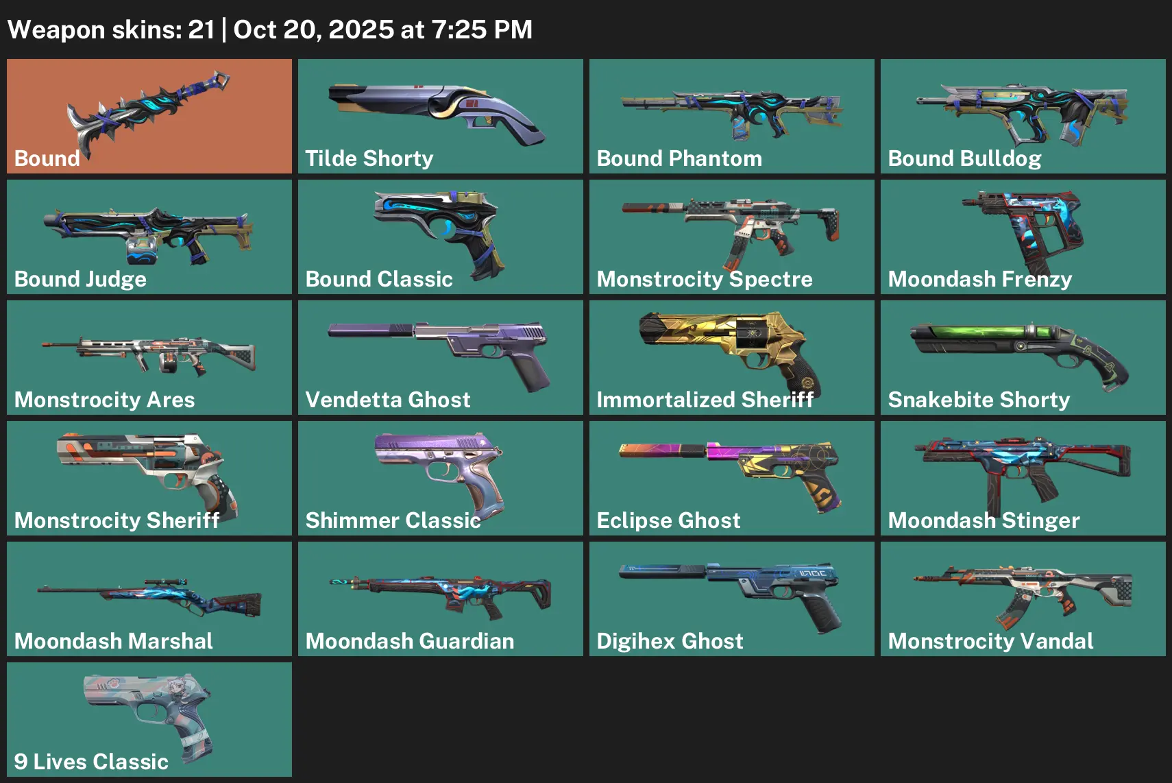 EU | 21 Skins | exp PLATINUM 1 | Monstrocity Vandal | Bound Phantom | Moondash Frenzy | Digihex Ghost | Eclipse Ghost | 9 Lives Classic | Bound | S4G