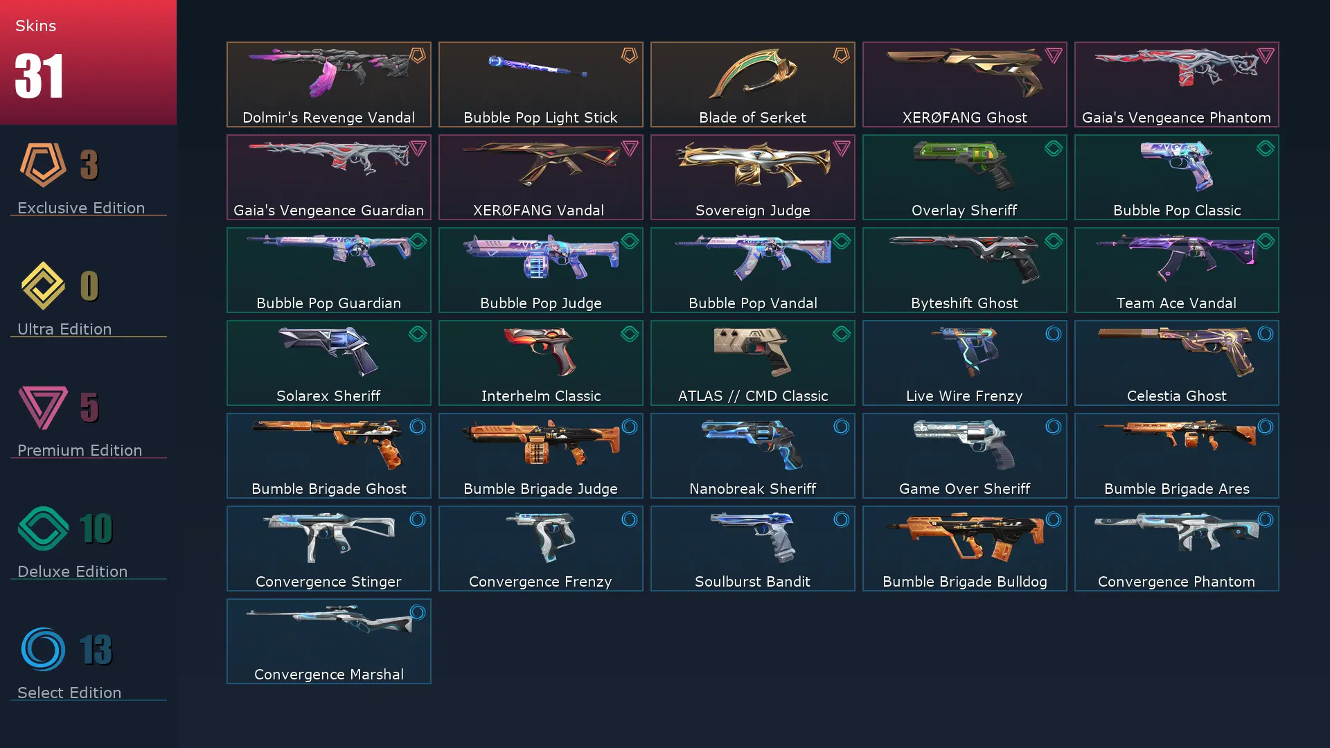 EU đȘ 31 Skins đ Gold 1 đŽââïž 29 Agents đ 218 Level đ Gaia's Vengeance Phantom đ Bubble Pop Vandal đ Dolmir's Revenge Vandal đ„ XERĂFANG Ghost đȘ XERĂFANG Vandal đ Gaia's Vengeance Guardian đ Bubble Pop Classic đ« Bubble Pop Judge