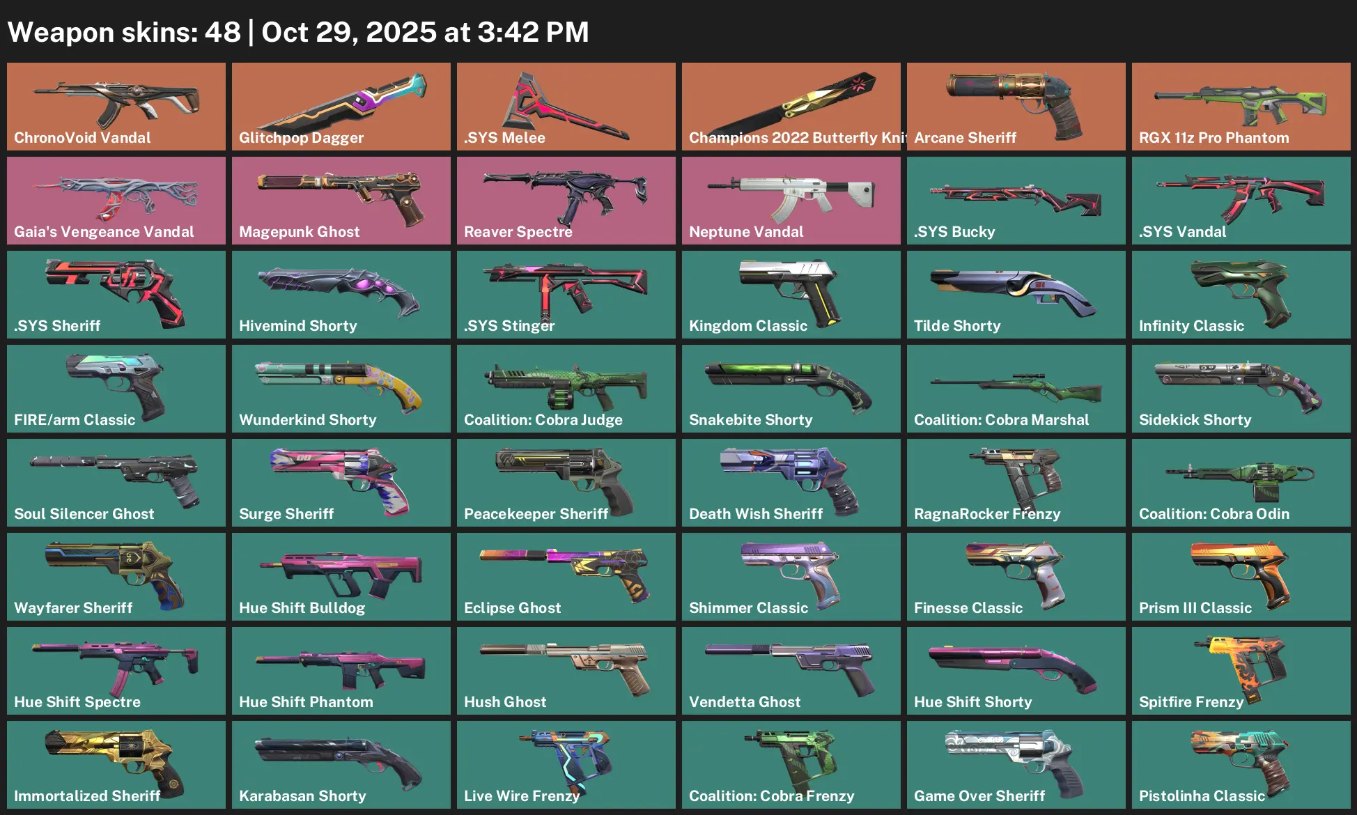 📍 EU 🏞 Unranked 🌦 48 Skins 👏 83 VP 🎖 21 Agents 🌷 Value: 23530 VP ✋ ChronoVoid Vandal ☕️ Glitchpop Dagger 🐺 .SYS Melee 💪 Champions 2022 Butterfly Knife 🐛 Arcane Sheriff 🚁 RGX 11z Pro Phantom