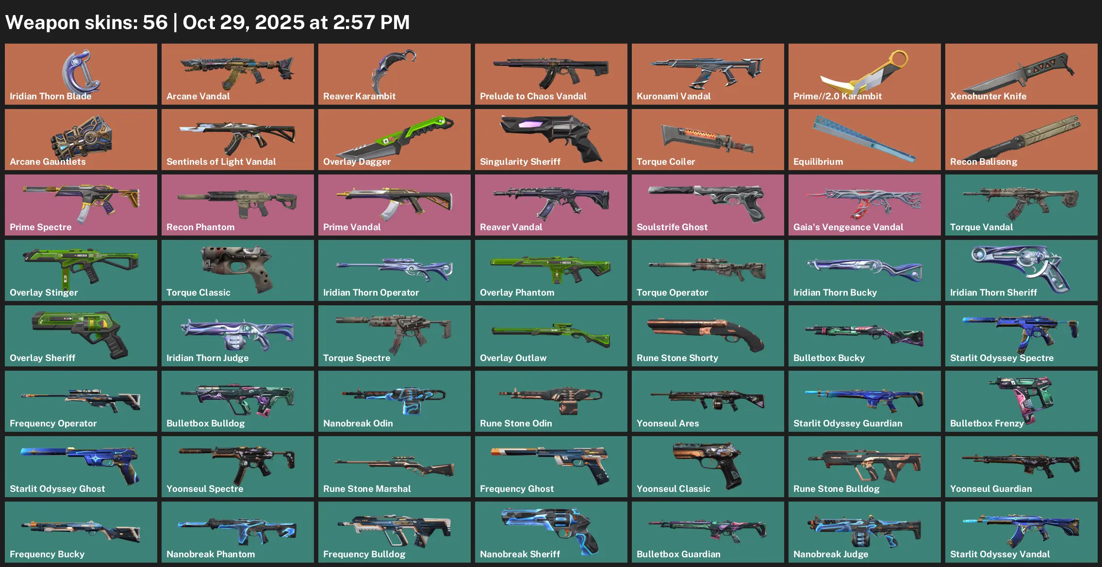 đ EU đ Unranked 𫹠56 Skins đ©° 82 VP đ 22 Agents đ Value: 43625 VP đ» Iridian Thorn Blade đ» Arcane Vandal đ Reaver Karambit đ Prelude to Chaos Vandal â°ïž Kuronami Vandal đïžââïž Prime//2.0 Karambit