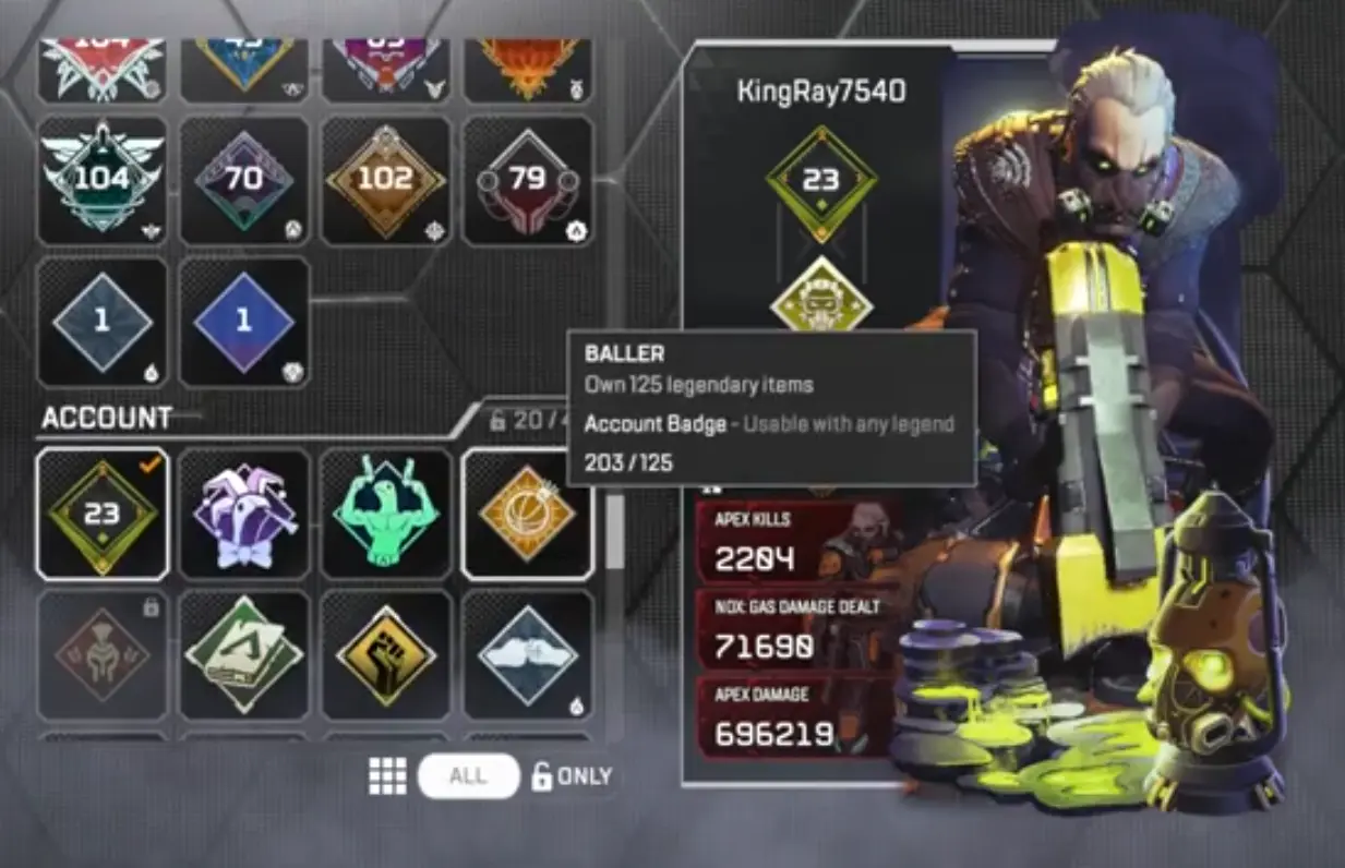 AP314 Caustic Heirloom, Level 523, 203 Legendaries, Rookie rank