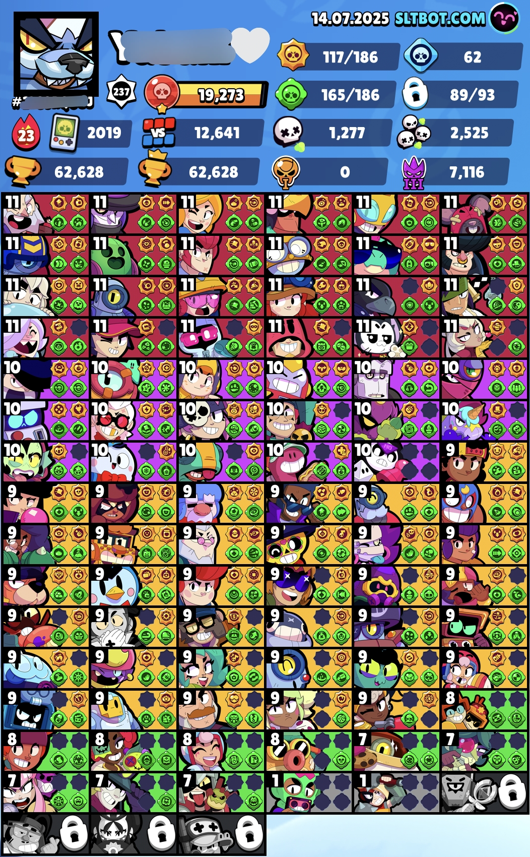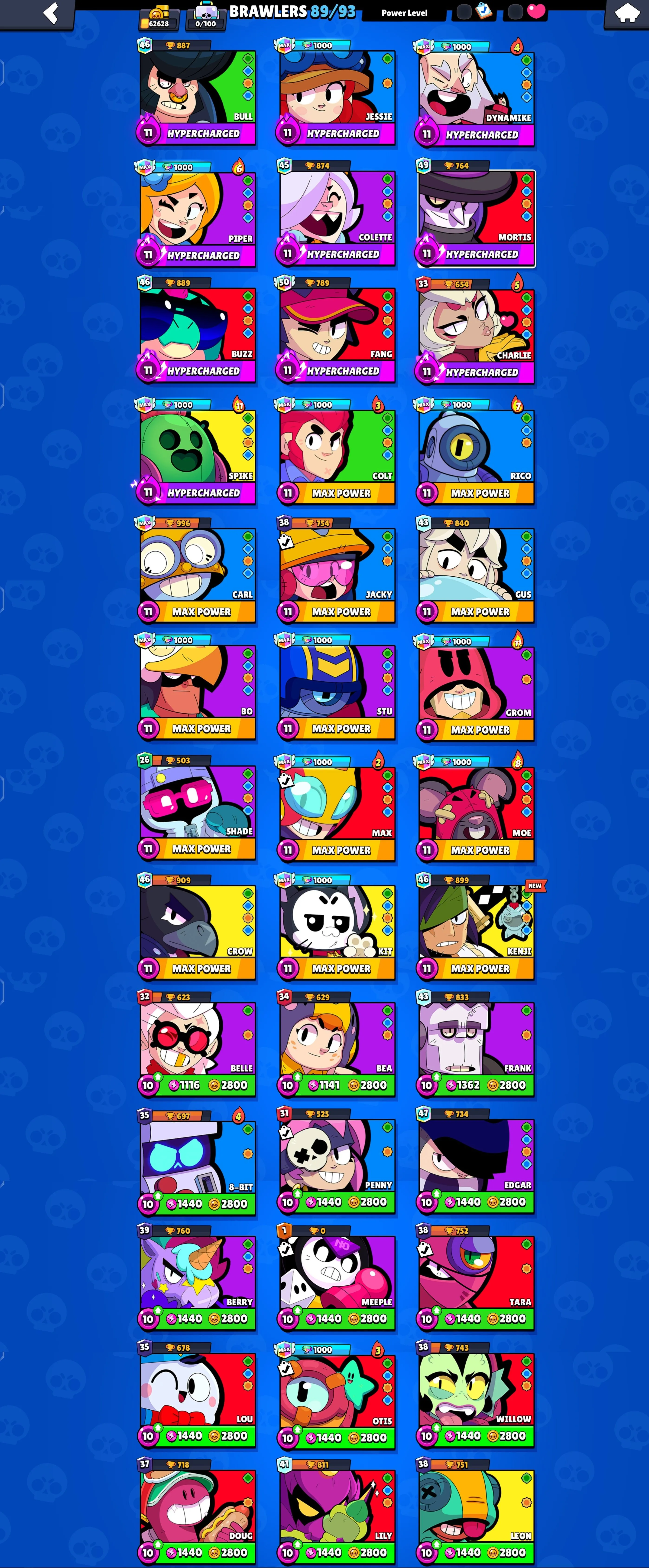 62k Trophies, 89 Brawlers [25 Max Power and 10 Hypers] 69 Rare, 76 Super Rare, 75 Epic, 6 Mythic, 5 Legendary and 4 Hypers | BSi19